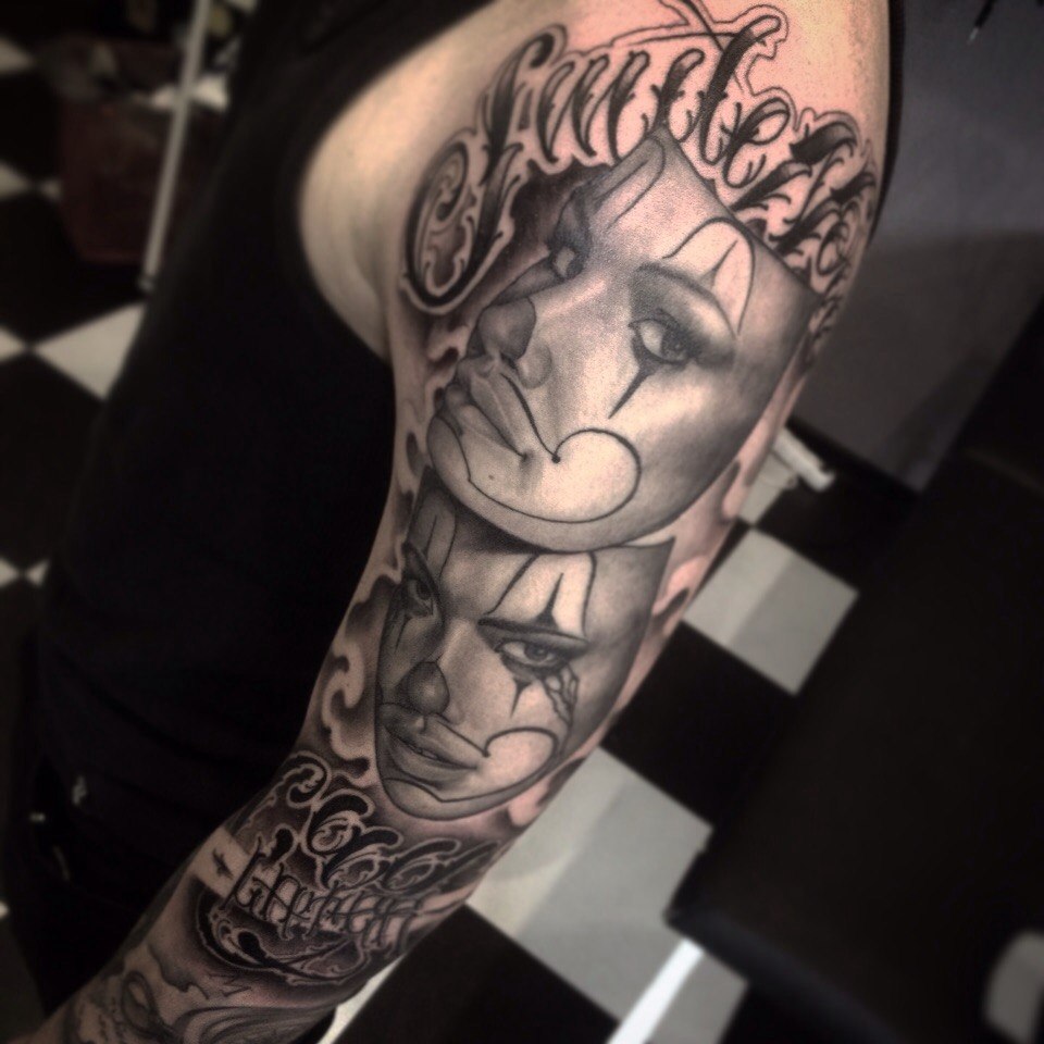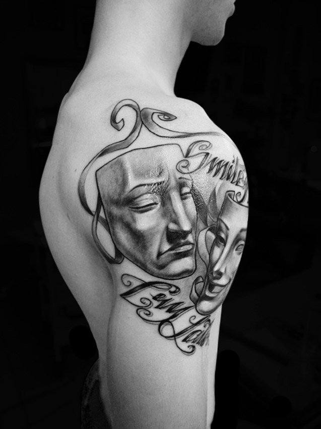 Le tatouage de deux masques, tragique et comique, a sa propre signification. Un tel tatouage semble très impressionnant, mais lorsque vous le choisissez, vous devez vous assurer que sa valeur correspond parfaitement à votre personnage. L'image d'un masque tragique dénote la tristesse et les larmes, et comique signifie joie et rire. Ces tatouages sont très populaires parmi les acteurs. Le masque qui pleure a sa propre signification.Une personne qui a appliqué un tel tatouage sur son corps n’est pas la même chose qu’elle se présente à d’autres.