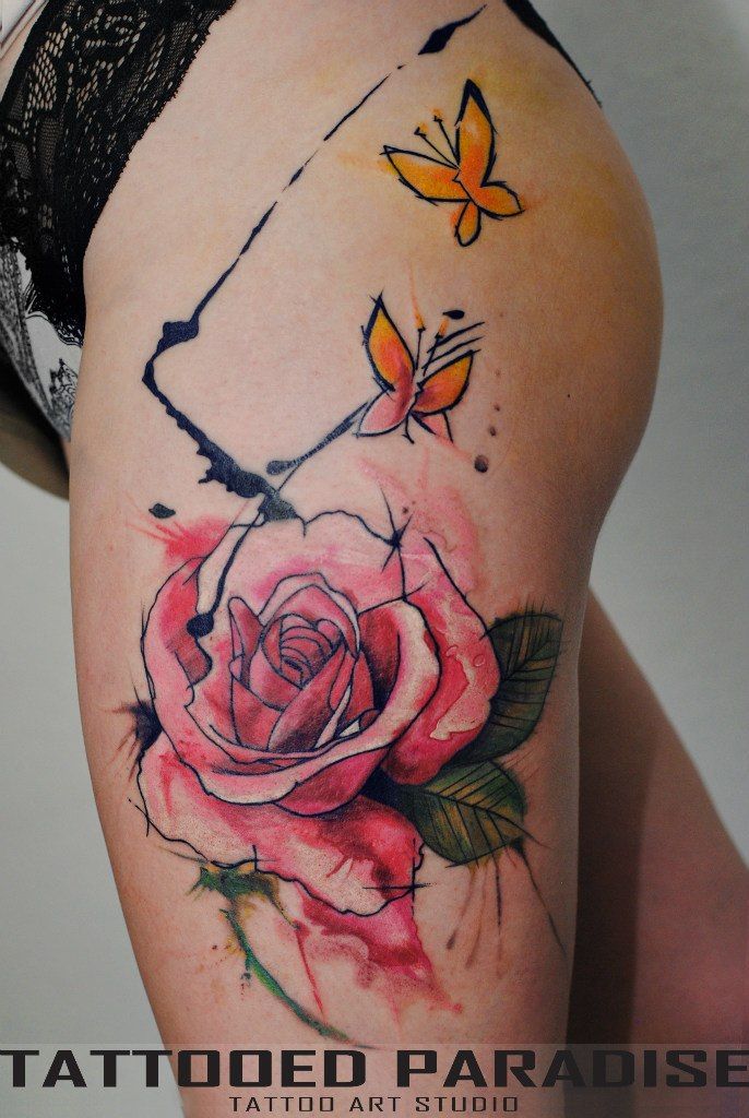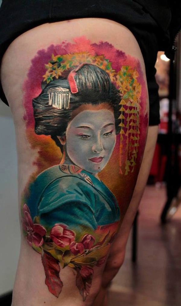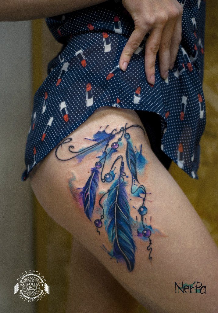 Les filles remplissent très souvent le tatouage de la hanche avec une signification secrète. Entre les mains professionnelles d’un artiste tatoueur, sur la hanche des filles, des œuvres de peinture à couper le souffle peuvent voir le jour dans lesquelles se déroule un récit inhabituel. Le thème des compositions réalistes peut être divers. Après avoir décidé de prendre une décision aussi audacieuse, la jeune fille devrait comprendre que le dessin choisi devrait apporter de la joie non seulement aux propriétaires, mais également à ceux qui l’entourent. Selon la palette de couleurs choisie pour le motif sur la hanche, vous pouvez sentir un soupçon subtil de caractère et de caractère ludique.