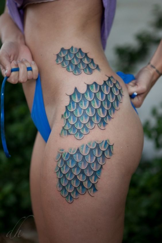 Un tatouage de la hanche dont le sens et le caractère sont appropriés est une exigence fondamentale pour les filles. Très souvent, sur les plages des stations balnéaires, vous pouvez voir des filles tatouées à la cuisse sous la forme d'écailles de poisson. Immédiatement, il y a des pensées qui se dressent devant vous comme une merveilleuse petite sirène de conte de fées, que l’on aime aussi raconter. Les filles tatouées de poisson sont très gaies et douées d'un caractère doux. Nous vous proposons des croquis de tatouages hanches sur le thème des habitants du monde aquatique.