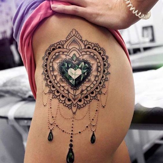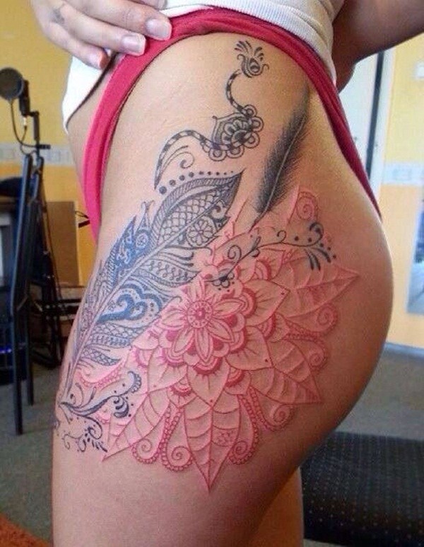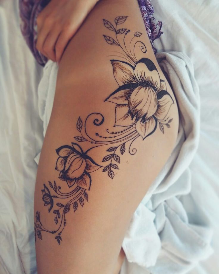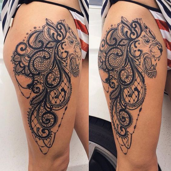 La cuisse n'est pas la plus petite partie du corps et les tatouages dans cette zone sont donc également assez grands. Un grand espace donne de grands espaces pour une envolée de fantaisie et, en fait, un tatouage est presque toujours caché des regards indiscrets. Les tatouages noirs sur la hanche peuvent également sembler très inhabituels et lumineux. Les tatouages de dentelle noire sont devenus les plus pertinents et les plus populaires parmi les jeunes femmes. Quelque chose ils ressemblent à des tatouages de mehendi temporaires.