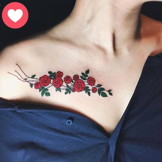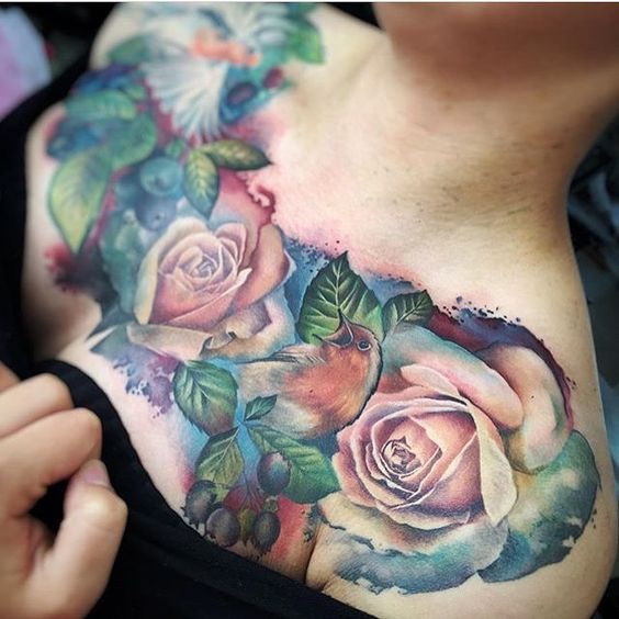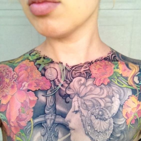 Tatouage sur la poitrine de femme: motifs floraux de couleur