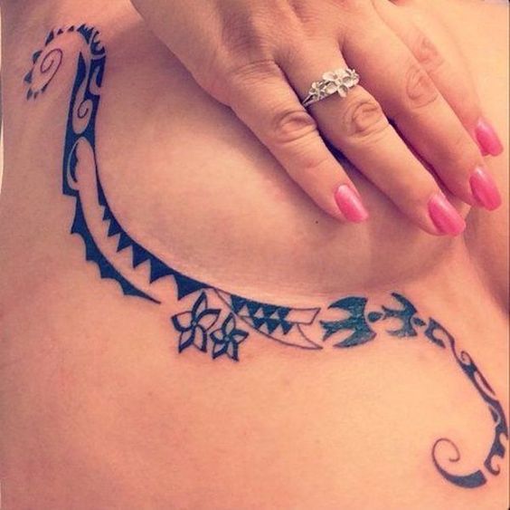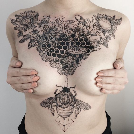Le choix d'un tatouage sous la poitrine est souvent basé sur le désir de cacher la cicatrice, par exemple après un implant. Une bonne solution serait de choisir un croquis sous forme de brindilles ou de fleurs qui mettent en valeur la beauté de la poitrine. Il y a de magnifiques dessins de tatouage sous les deux seins. Dans ce cas, le tatouage commence généralement par le centre et se propage dans les deux sens.