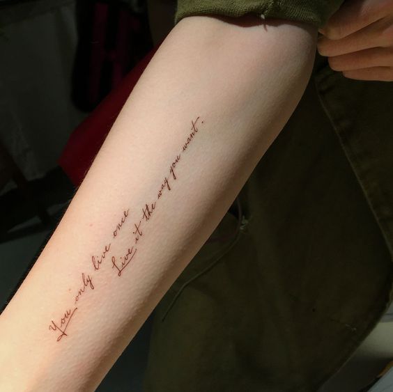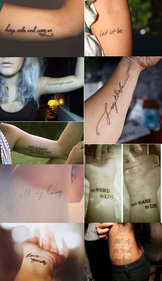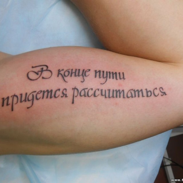 Inscription de tatouage est pour la vie, alors prenez-le au sérieux et réfléchi. Cela ne coûte rien de passer un peu de temps et de décider à l'avance du domaine d'application, de la signification de la phrase, de la langue, du type et de la taille de la police. Cela peut même être les phrases les plus incroyables. Et quand vous avez tout décidé, n'hésitez pas à vous rendre chez le spécialiste en tatouage.