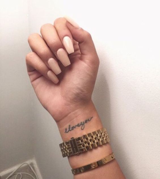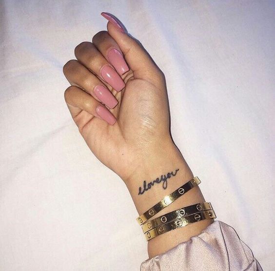 Notez qu'il est très important, lors de l'application d'un tatouage sous la forme d'inscriptions, de choisir une zone d'application. Tout d'abord, il est nécessaire de décider si le tatouage ne sera visible que par vous et vos proches, ou si vous souhaitez partager son interprétation et sa signification avec d'autres. La main est une zone ouverte aux yeux des autres. L'option la plus courante pour les femmes et les hommes est d'inscrire sur le secteur de la main. L'option convient à l'expression de soi, car vous pouvez représenter à la fois une petite phrase et un texte volumineux. Il est important de le positionner correctement. Par exemple, si vous mettez une inscription sur vos mains ou vos doigts, il s’agit d’un maximum de deux mots dans un format lisible. Mais sur l'avant-bras, vous pouvez mettre une plus grande inscription d'une certaine police et d'une certaine taille. Une petite inscription est appliquée sur le poignet, qui peut éventuellement être cachée sous une montre ou un bijou.