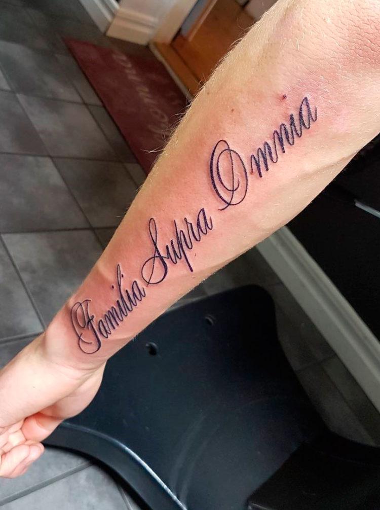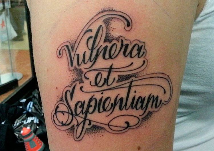 Les tatouages pour hommes sous forme d’inscriptions ressemblent davantage à une version classique capable d’exprimer brièvement des pensées et des attitudes face à la vie.Les inscriptions en latin pour hommes sont élégantes et esthétiques et attireront certainement les regards du sexe opposé. Chez les hommes, l'endroit le plus populaire sur le corps pour l'inscription est la poitrine. Il y a suffisamment d'espace sur le buste masculin pour appliquer un grand nombre de mots ou utiliser une police plus grande. Il est à noter que cette inscription sera visible de loin et facile à lire.
