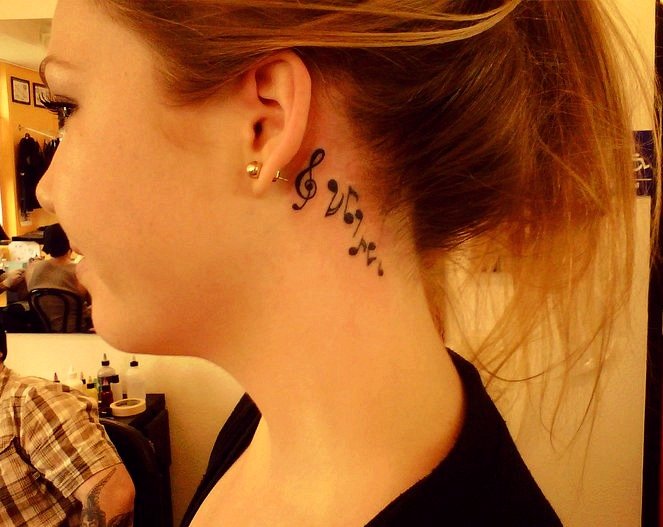 Le tatouage réalisé derrière l'oreille n'a pas d'importance particulière. Un tel motif pectoral est plus décoratif. Les filles choisissent des notes de tutu derrière l'oreille pour souligner la féminité, la tendresse et leur sexualité. Beaucoup de filles, tatouées avec l’image de plusieurs notes miniatures derrière l’oreille, cherchent à mettre l’accent sur la courbure et la beauté du cou. Un tatouage masculin avec l'image de notes derrière l'oreille dira aux autres l'appartenance de cette personne au monde de la musique.