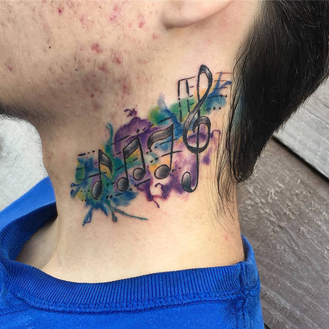 Les tatouages avec l’image de notes sur le cou sont principalement utilisés par les femmes. Bien que dans l'environnement musical, il existe de tels tatouages chez les hommes, également directement liés à la musique. Les motifs de note sur le cou sont principalement utilisés dans les petites tailles. Très probablement, ils peuvent être appelés miniatures. Un tatouage fait sur le cou derrière l'oreille suggère que vous êtes, dans une certaine mesure, une personne qui n'est pas de ce monde. La vie du propriétaire d'un tel tatouage est rythmée par sa propre mélodie.