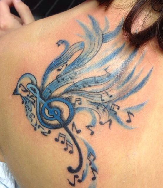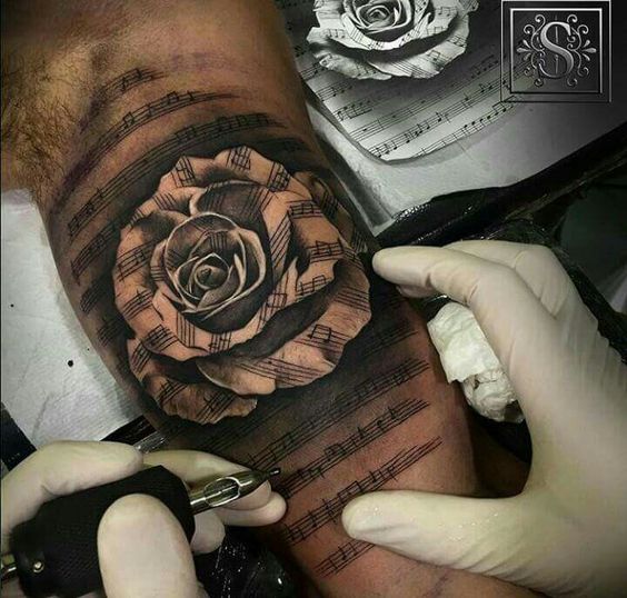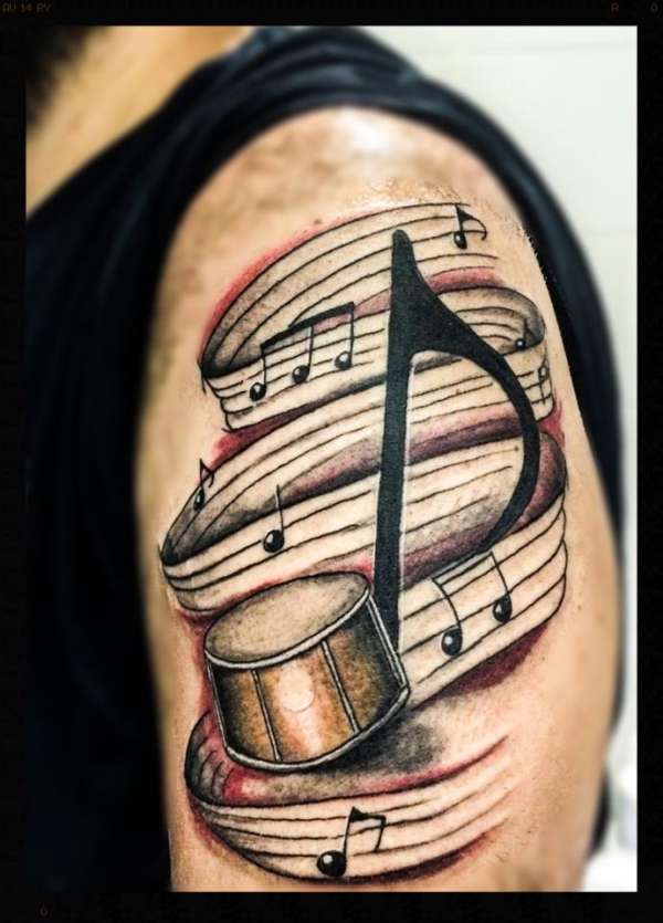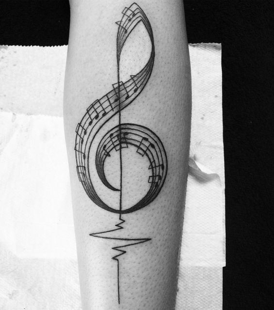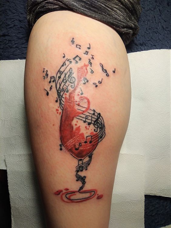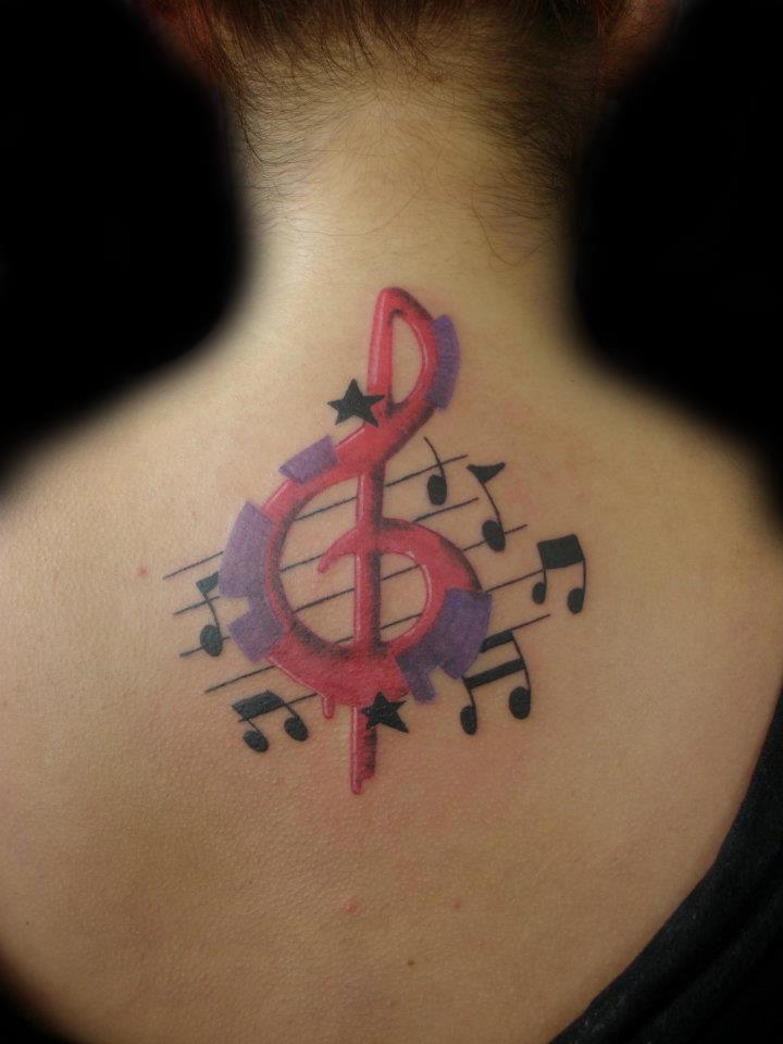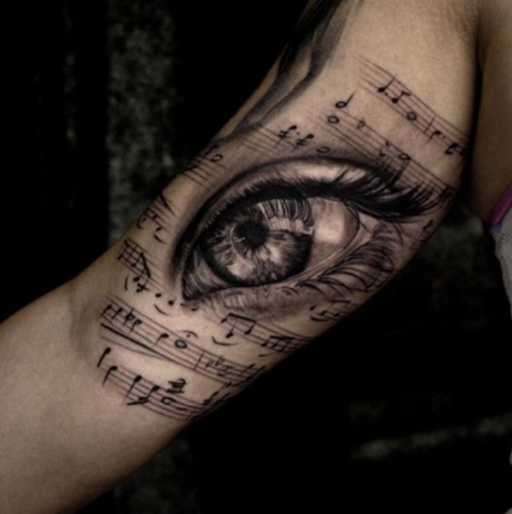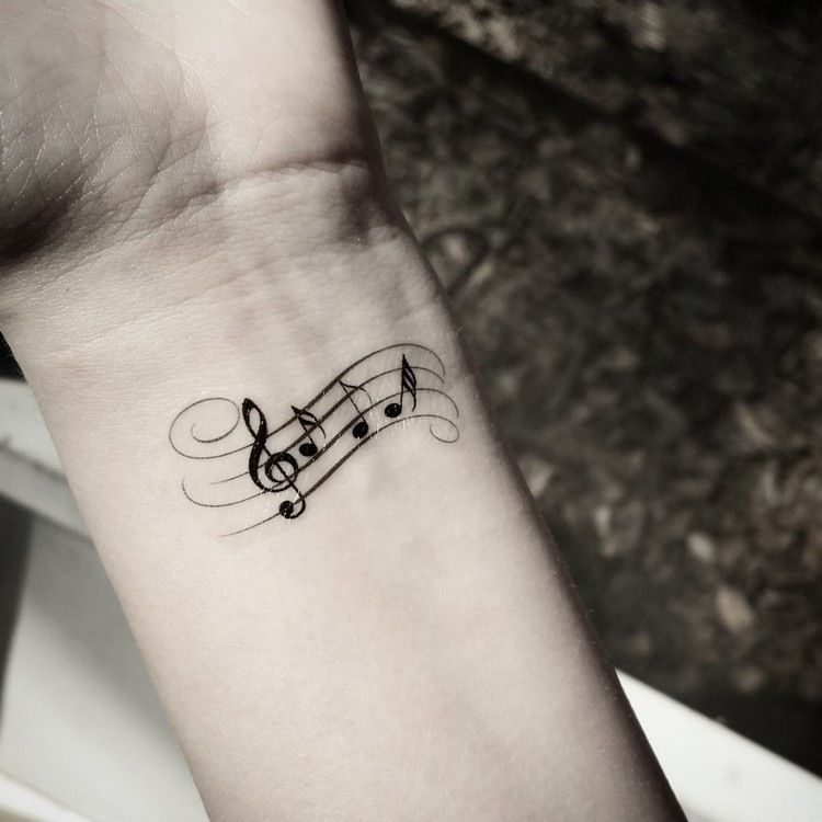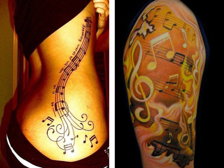 On pense qu’un tatouage avec l’image de notes ou un bâton musical signifie un amour ou un rapport direct avec la musique, ainsi qu’une nature subtile et créative. Très souvent, un tel tatouage est appliqué par des personnes possédant un instrument de musique ou des personnes ayant une âme créative.