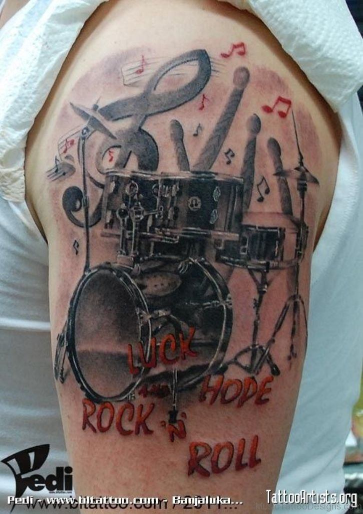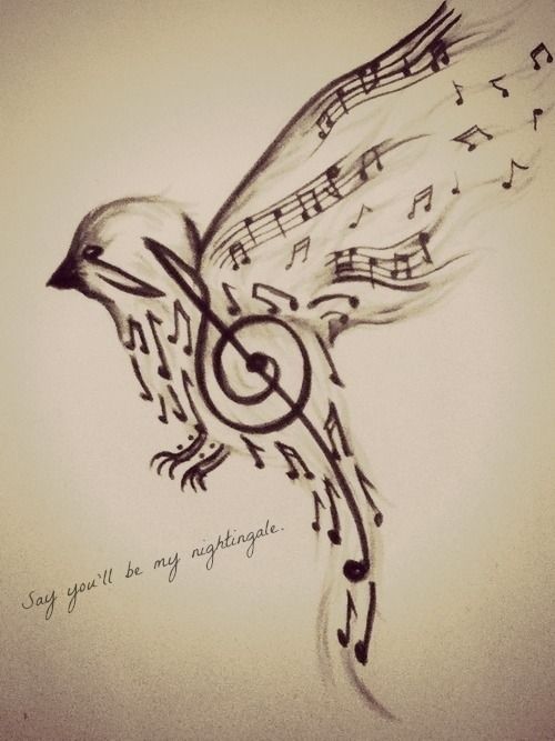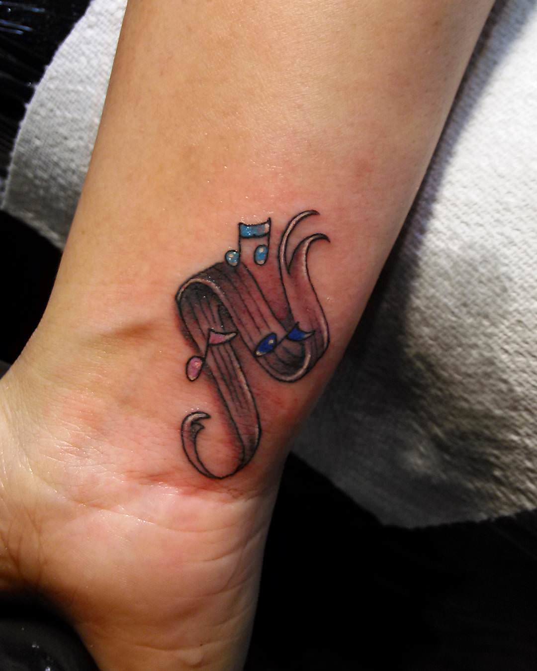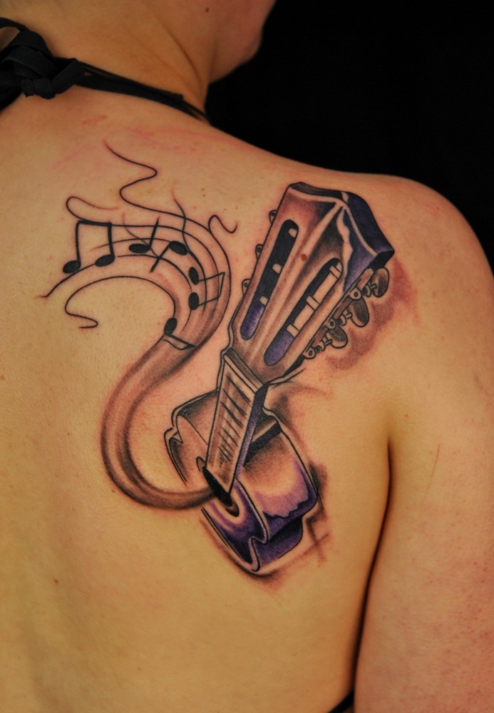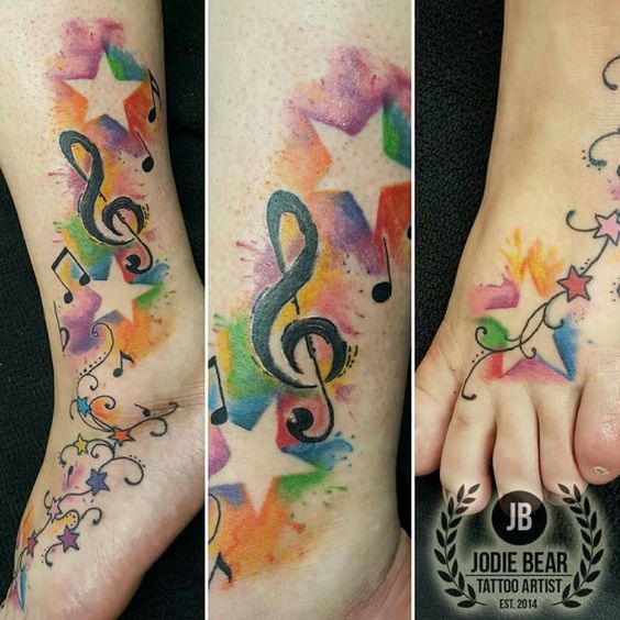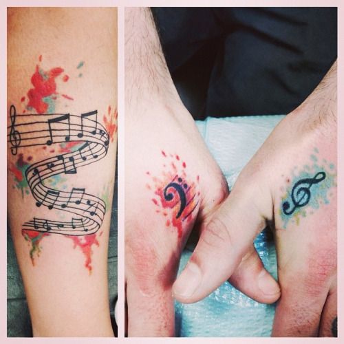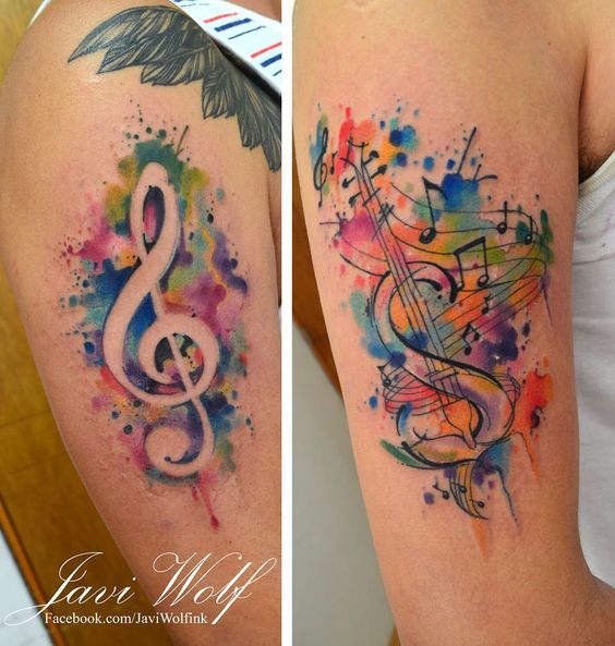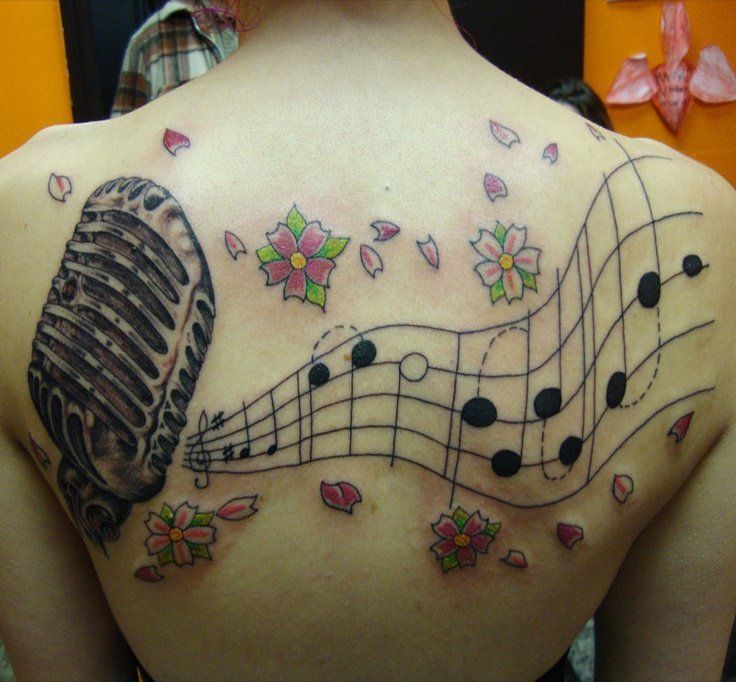 On pense qu’un tatouage avec l’image de notes ou un bâton musical signifie un amour ou un rapport direct avec la musique, ainsi qu’une nature subtile et créative. Très souvent, un tel tatouage est appliqué par des personnes possédant un instrument de musique ou des personnes ayant une âme créative.