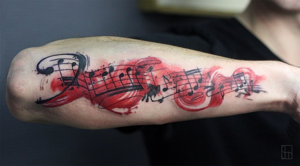 Un tatouage de notes sur le bras est très harmonieux.Cela peut être un petit tatouage sous la forme de plusieurs notes au poignet, faites comme un bracelet ou verticalement. Superbe tatouage avec une portée sur l'avant-bras. Les tatouages avec des notes sur la main sont utilisés par les personnes qui veulent montrer aux autres leur implication dans la musique ou dans des événements en rapport avec des activités créatives.