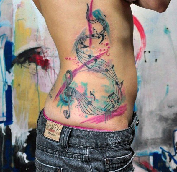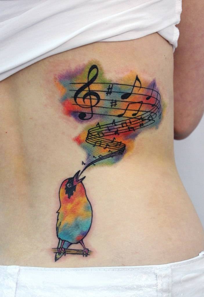 Le tatouage avec l'image des notes est très populaire chez les femmes. Très souvent, les filles complètent les notes par divers ajouts sous forme de cœurs, d'étoiles ou de fleurs, ainsi que par divers motifs et inscriptions. Un tatouage de couleur à l’image de notes sur la jambe de la femme mettra en valeur la féminité de sa propriétaire. Les dames appliquent également des tatouages avec l’image de notes ou une portée sur la taille, le cou ou le dos. Un tatouage avec l’image de notes ou un bâton musical sur le corps d’une femme racontera aux autres le désir de la fille de relier sa vie à la musique ou si elle y est déjà connectée. Aujourd'hui, le beau sexe choisit des tatouages avec l'image de notes dans le style de l'aquarelle ou de la vieille école. Un tatouage à orientation musicale est particulièrement impressionnant s’il est complété par divers motifs.