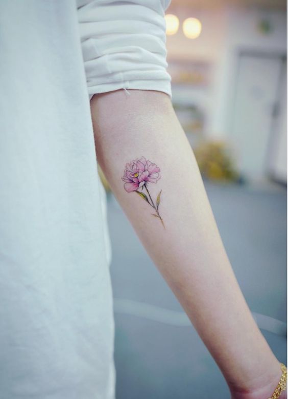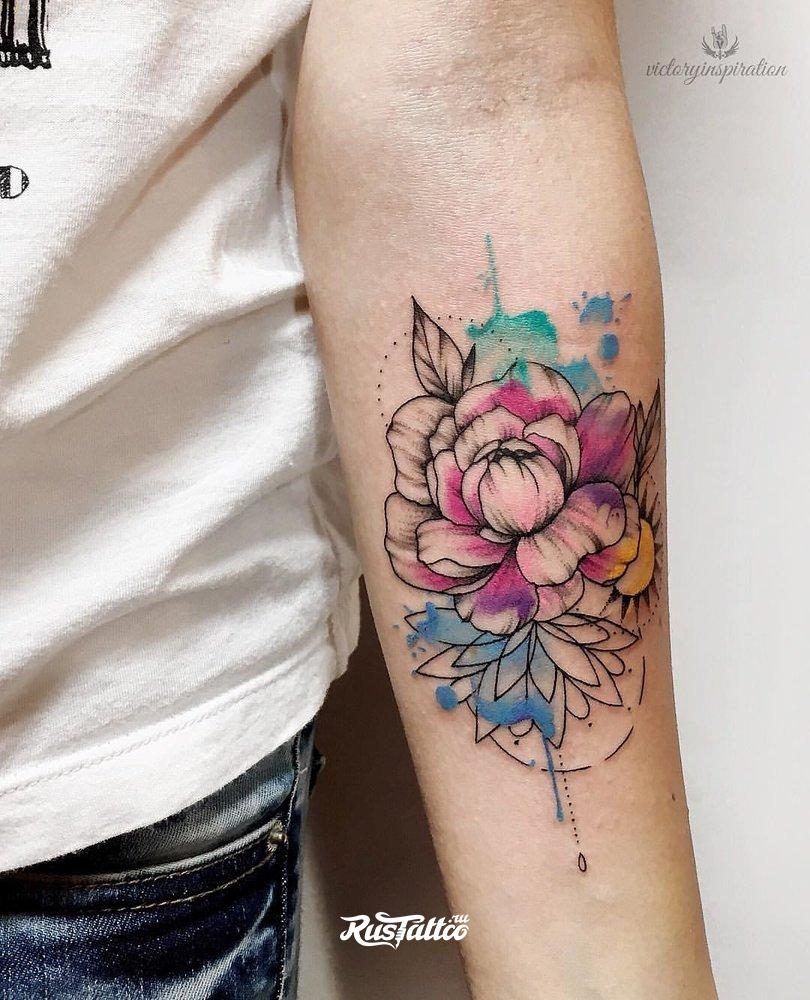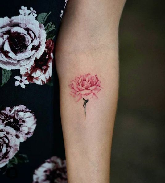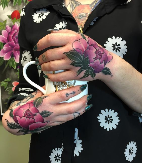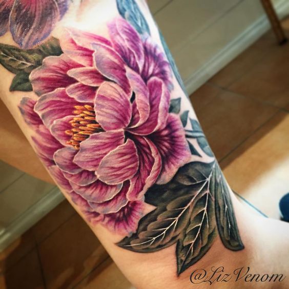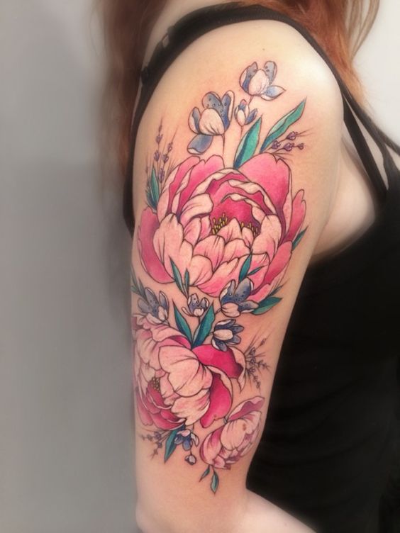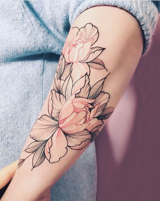 Le tatouage d'une fleur de pivoine sur son bras est superbe. Mais ici, l'image devrait être petite. Cela peut être une seule fleur ou une mini image d'un bouquet. Quel sera le motif dépend de la signification que vous donnez à votre tatouage? Les tatouages de pivoines sur l'épaule sont très populaires et se déplacent doucement jusqu'au cou. Un tel tatouage peut être plus volumineux. Une autre version de la grande image est un tatouage en forme de manchon avec des pivoines. Il part du poignet, traverse tout le bras, atteint la base du cou ou plus haut en passant à la clavicule. Si vous décidez de faire un dessin miniature d'une pivoine, qui aura une signification purement personnelle, la partie sur laquelle elle sera exécutée importera peu. Mais le plus souvent, un tel motif est appliqué au poignet. Le tatouage de pivoine sur le bras a une solution universelle pour les femmes et les hommes.