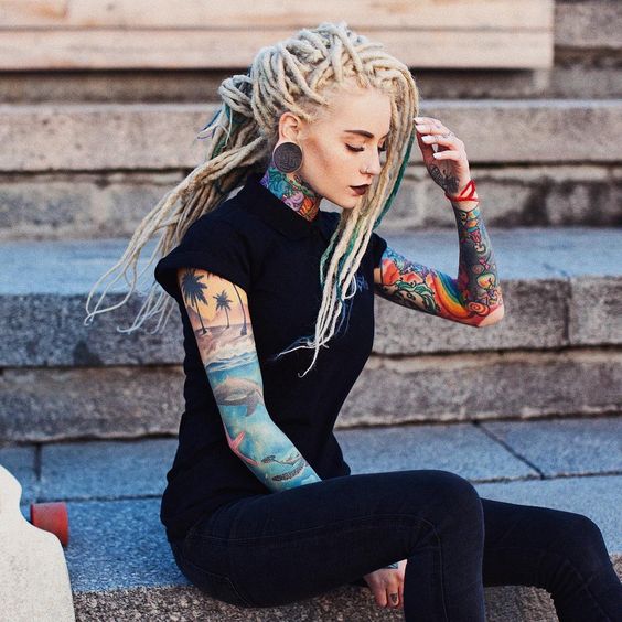 L'esthétique de la manche dépend du style du tatouage. Il existe des dizaines de genres de beaux tatouages en couleurs pour les hommes et les femmes à travers le bras. La provocation est le truc principal du tatouage polka couleur trash polka. Sur des images de ce genre, vous verrez le plus souvent de l'ironie, du sarcasme et même un langage obscène. Tresh Polka combine le look magnifique du dessin et le regard douloureux de la mort et de l'horreur. Un grand dessin semble plus intéressant, car vous pouvez y exprimer votre sens unique du tatouage. Le style de réalisme est considéré comme le plus difficile à réaliser dans un tatouage coloré sous la forme d’une manche, mais très demandé et à la mode. L'image sur la main de ce type implique une exécution à grande échelle du dessin et produit le plus souvent une combinaison de portraits, faisant partie de la nature ou de l'architecture ou un motif du monde de la science-fiction. Les dessins sur le corps dans le style de la vieille école tirent parti de la luminosité des couleurs et de la précision des lignes, de manière à ce qu'ils soient aussi clairs et volumineux que possible. Il y a souvent des images de visages, de sirènes, de navires, de roses des vents, parfois de papillons et d'animaux à caractère agressif, comme un tigre, un jaguar.