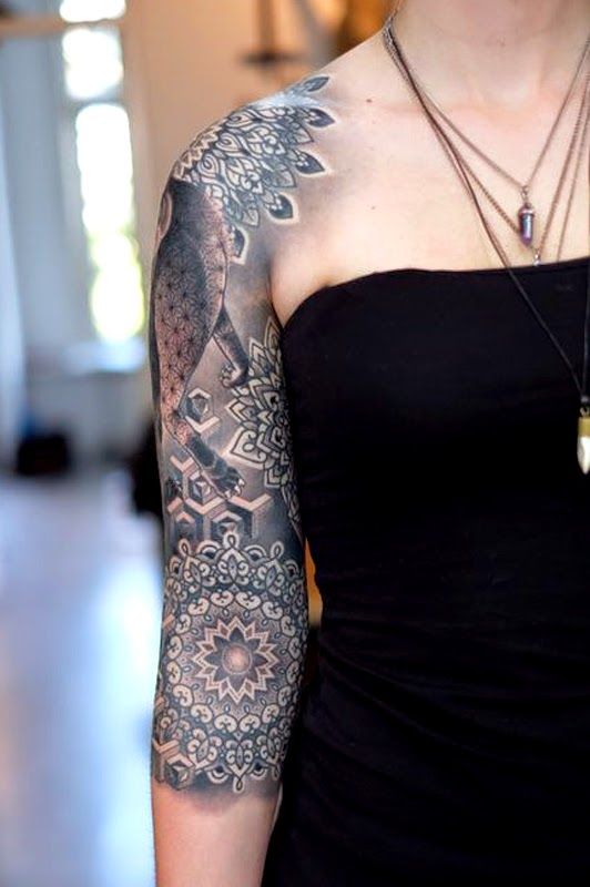 La structure du tatouage peut occuper la moitié, la troisième ou la quatrième du bras. La partie sélectionnée pour le tatouage est entièrement peinte: plusieurs couleurs et des dizaines d’éléments y sont combinés. Dans un tatouage au coude, la représentation du monde animal exprime le dévouement, le courage, le courage. Eh bien, l'image d'un artiste rock vous indiquera votre attitude vis-à-vis de la créativité et un lien possible avec la musique.