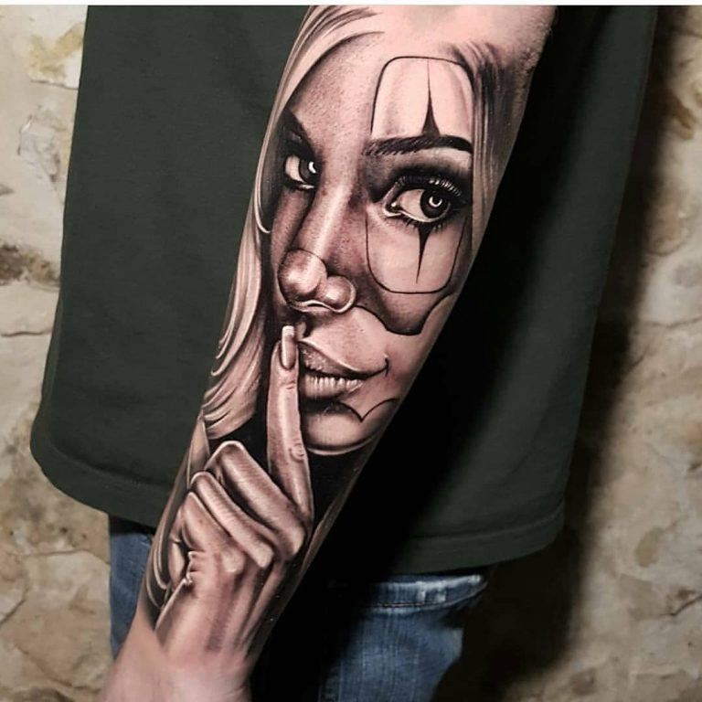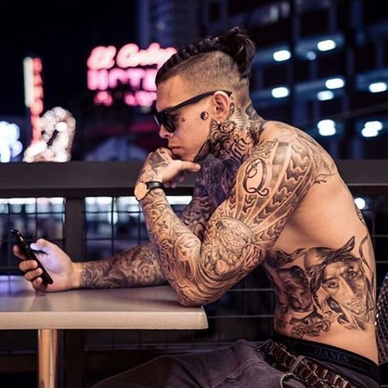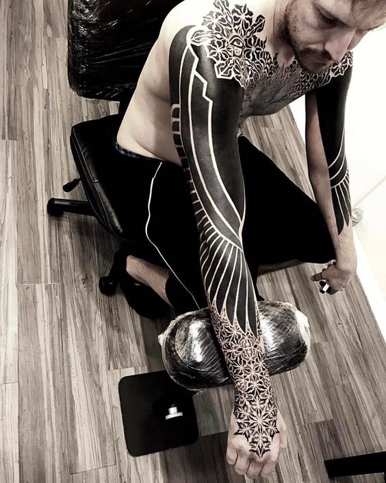 Le travail au noir est un genre de conception de tatouage où l'image est un avantage de la couleur noire avec le remplissage maximum de la zone du bras. Toutefois, cela n’affecte pas les modèles de sous-vêtements. Il y a des options quand ils remplissent simplement une partie du corps avec du noir, ce qui semble très brutal.Chicano est l'option idéale pour créer un tatouage noir unique sur votre bras. À première vue, le sujet du tatouage peut sembler un peu sombre, mais si vous regardez de plus près, vous pouvez considérer le sens profond, le reflet des positions de vie et des valeurs morales de la personne représentée. Souvent, ils représentent le visage de la jeune fille, ainsi que des crânes, des croix, des visages de célébrités, des phrases et des devises, des thèmes bibliques.