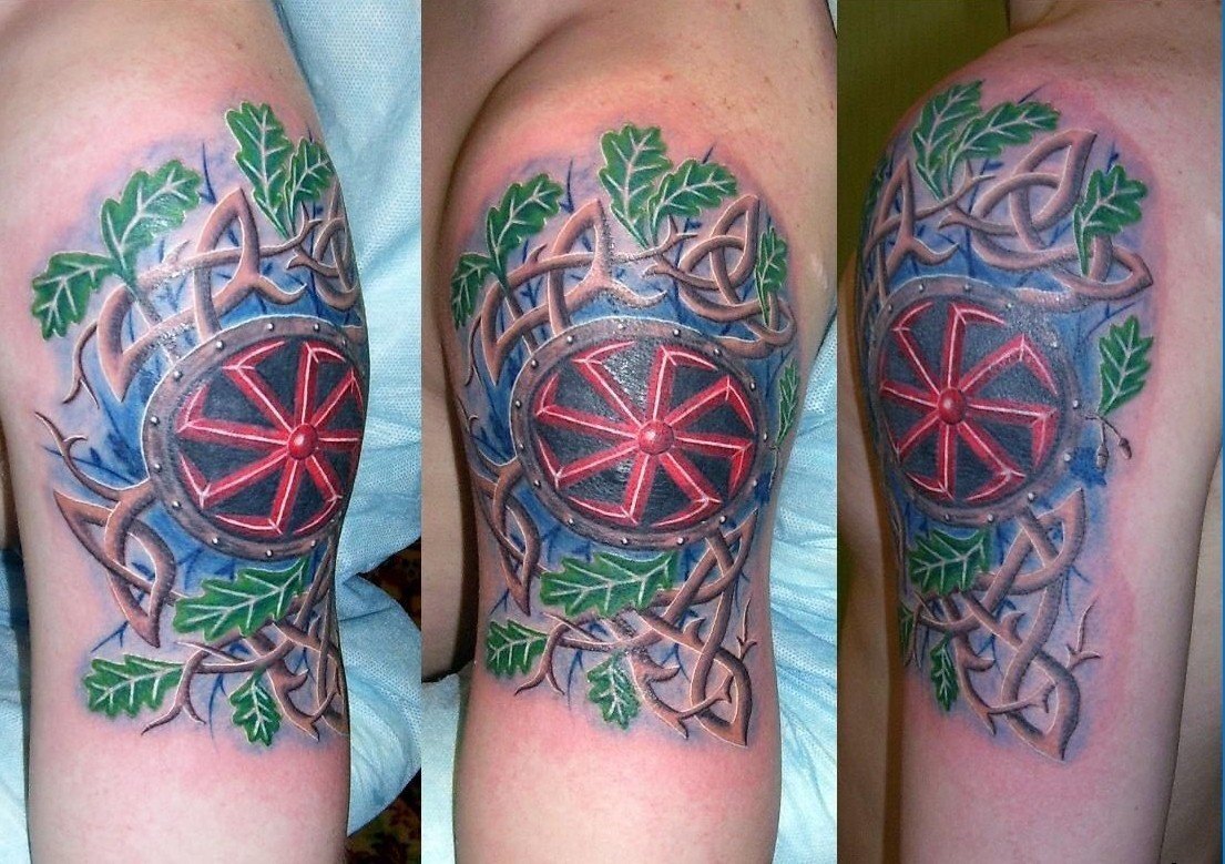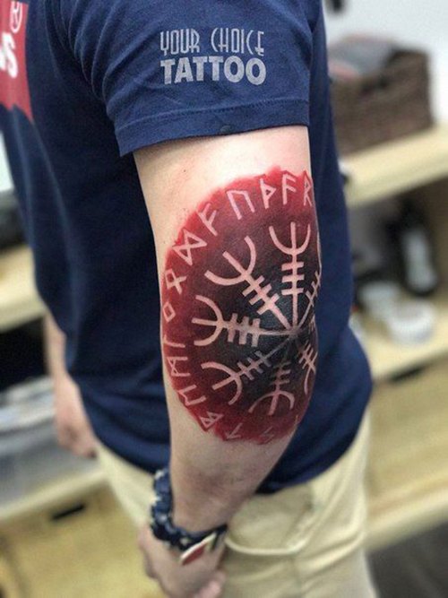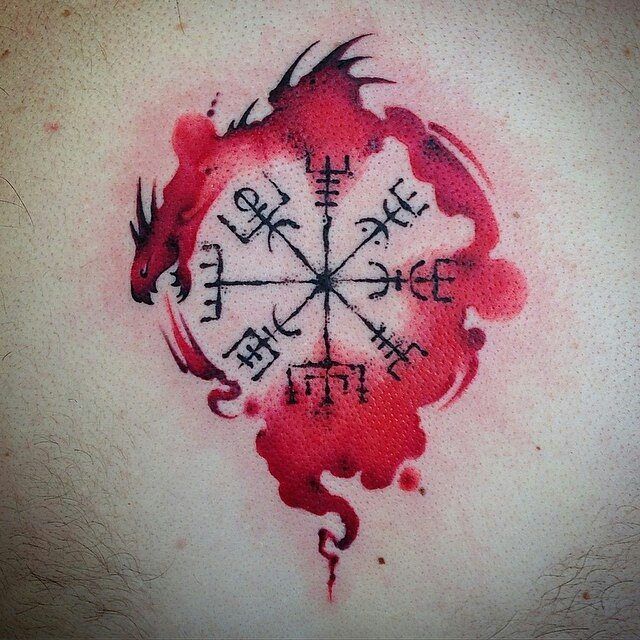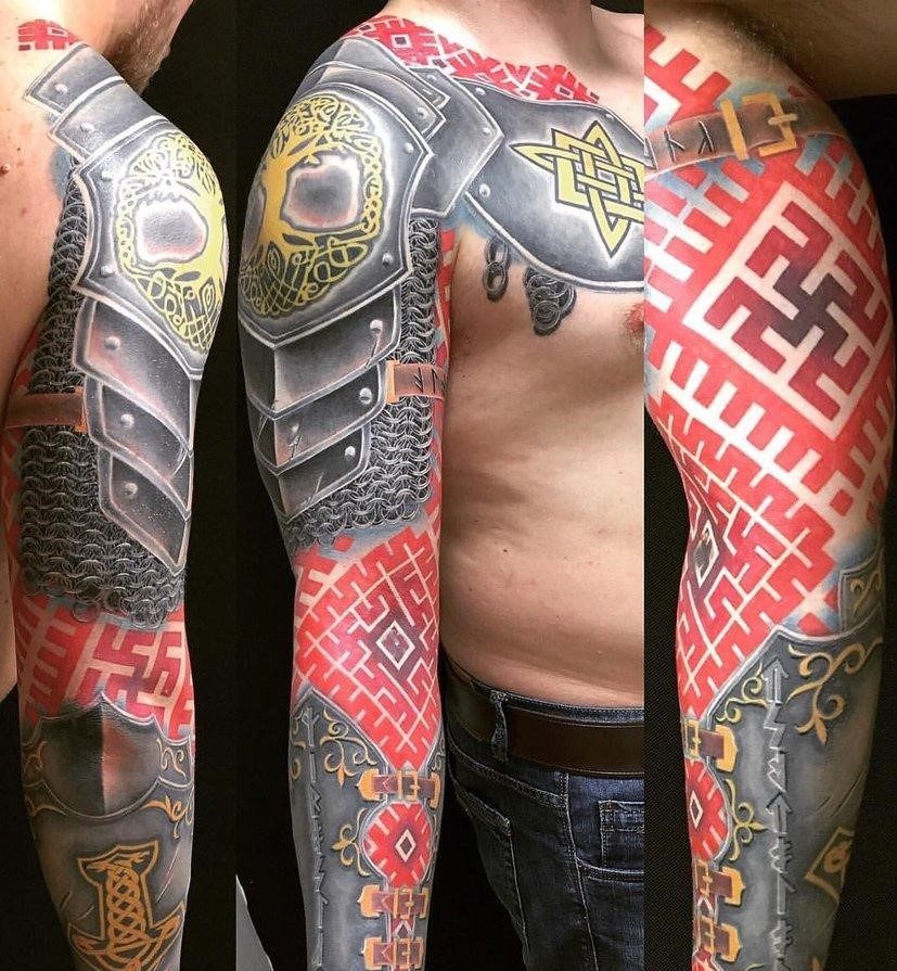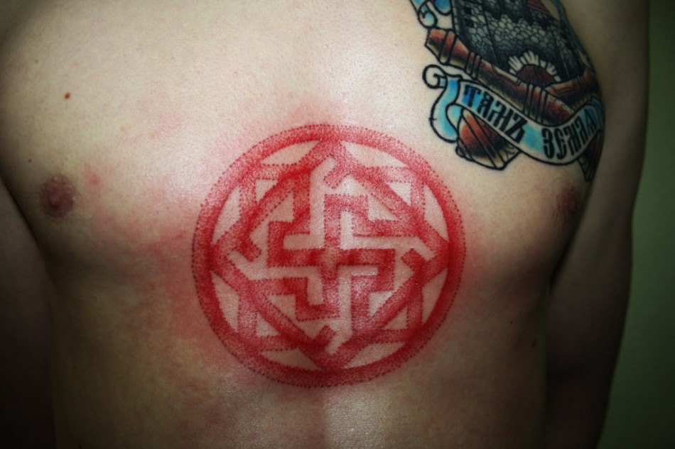 Les runes sur un ton rouge sont très courantes chez les filles et les hommes. La couleur rouge en combinaison avec des motifs runiques incarne la valeur, la foi et le désir de leurs objectifs. Le plus souvent, les symboles rouges sur le corps sont interprétés par des hommes confiants qui cherchent à exprimer leur indépendance.