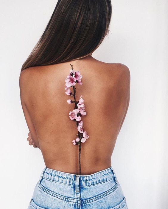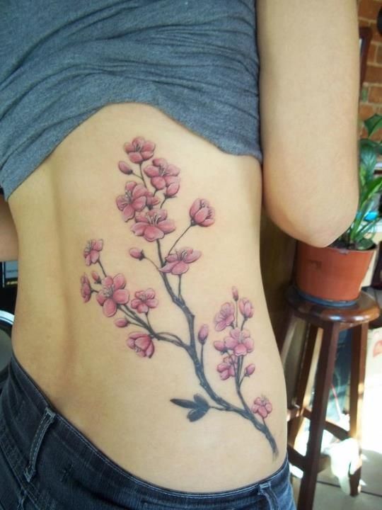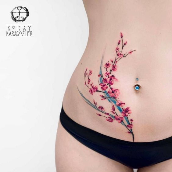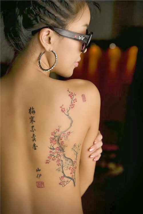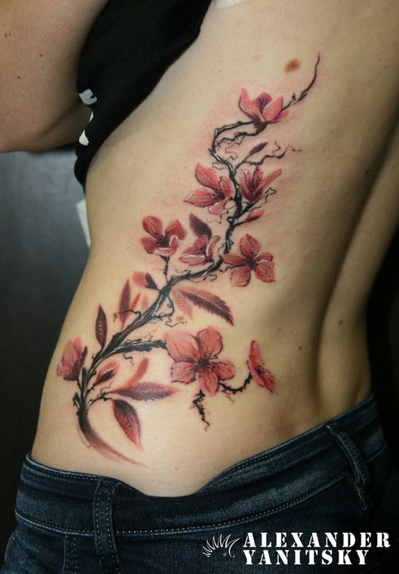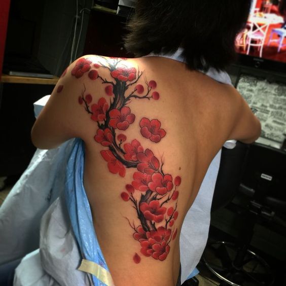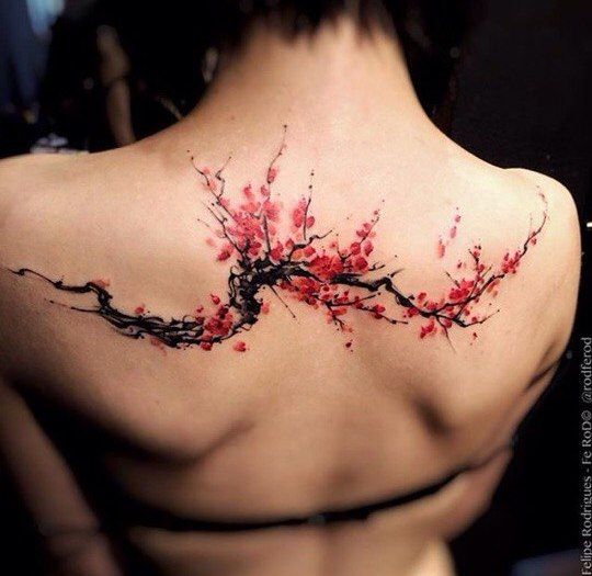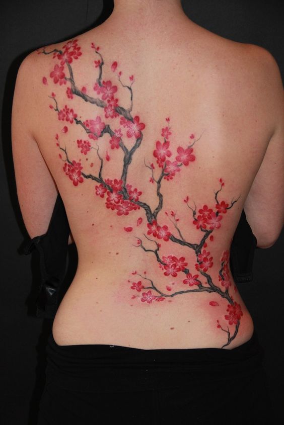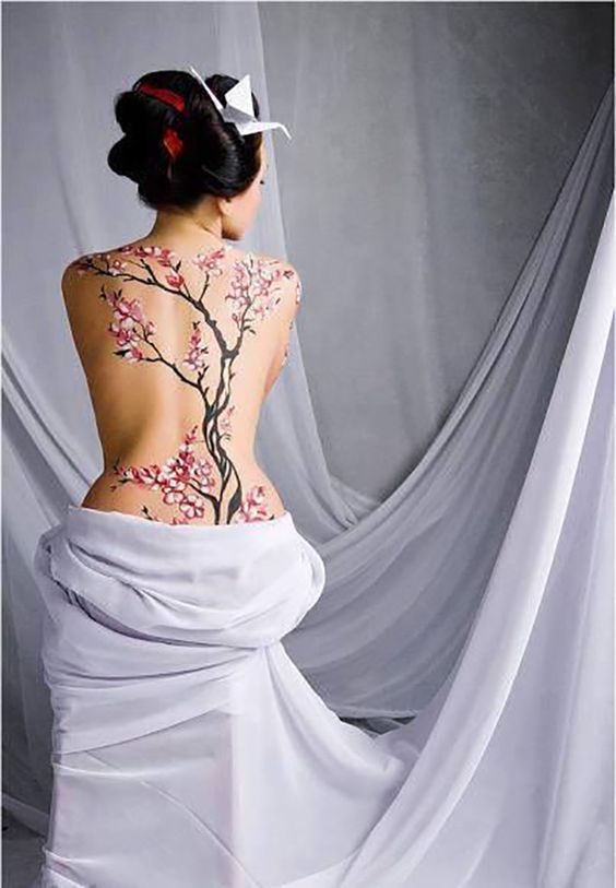 Tatouage du corps féminin avec arbre de sakura décorer. En plus de la beauté et de la sophistication, le tatouage démontre l’éducation du propriétaire. Un arbre aux fleurs épanouies est synonyme d’espoir perdu, de déception et de rêves non réalisés. Et une sakura florissante avec toute sa beauté indique le succès et les espoirs exaucés.