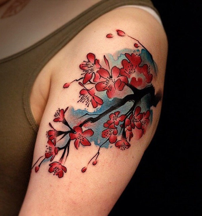 Sakura branch indique que son propriétaire est pressé d'explorer le monde, de faire de bonnes actions, d'apprécier les bonnes actions et de chérir chaque moment de la vie. Sur le corps des filles, la branche sakura témoigne d'un amour sincère, du sacrifice de soi, du dévouement, de la fiabilité par rapport à ses proches.Même en cas de rupture entre les amants, la fille au tatouage de sakura garde tout le souvenir des bonnes minutes passées ensemble. Une branche avec sakura sur le corps aide à croire et à n'espérer que de bons événements dans le futur.