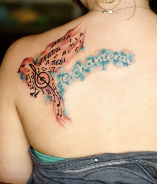Les filles aiment beaucoup les tatouages illustrant diverses variations de la clé de sol. Mais utilisez souvent son affichage dans le cadre d’une composition vibrante. Le tatouage de la clé de sol est beau et attrayant, complété par l'image d'oiseaux, d'animaux, de fleurs, d'ailes, de papillons, de coeurs, d'étoiles ou d'autres inscriptions. Un tatouage avec de tels ajouts symbolise la subtilité de l'âme féminine, la légèreté, la trépidation, la légèreté et la romance de son propriétaire.Néanmoins, le tatouage est principalement utilisé par les filles directement liées à la musique. Souvent, les femmes choisissent un tel tatouage dans une palette de couleurs utilisant des couleurs vives et accrocheuses, une technique originale et un style de performance.
