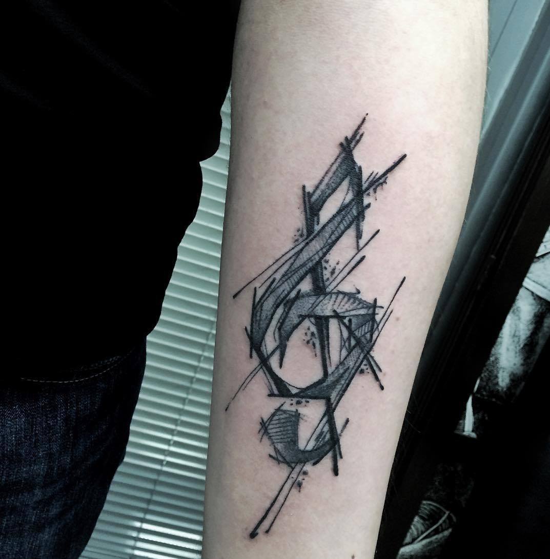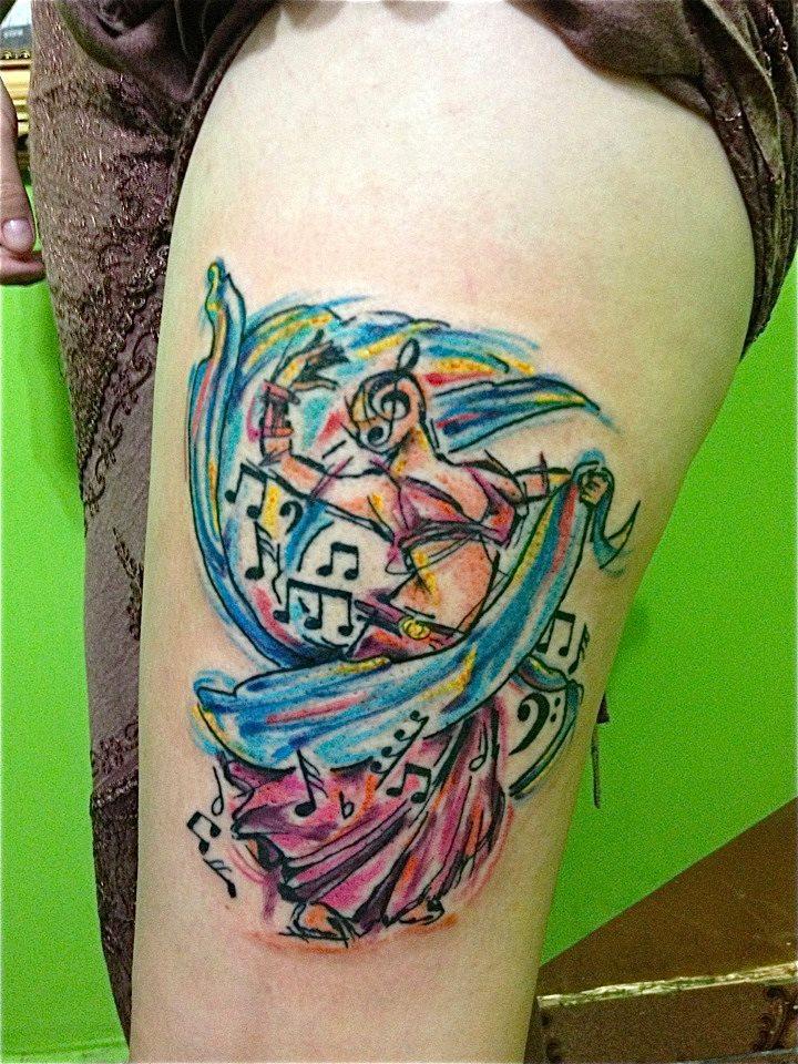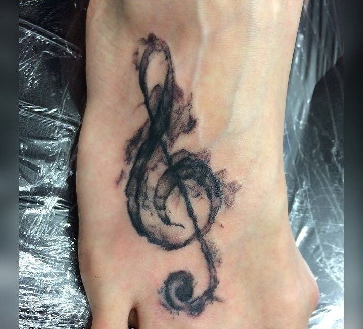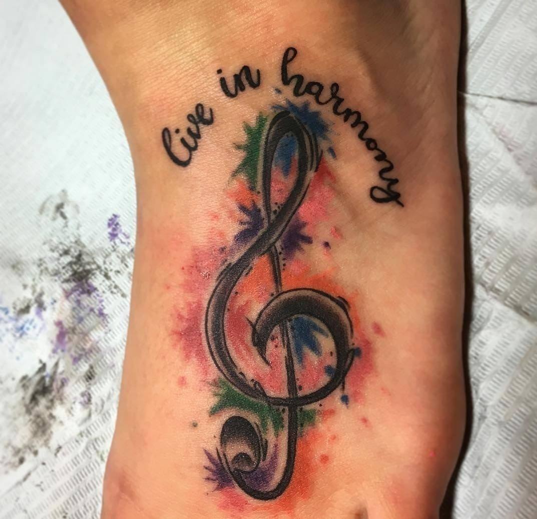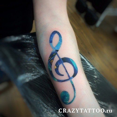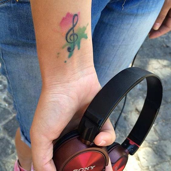Le tatouage de la clé de sol dans le style de l'aquarelle est le plus souvent utilisé par le beau sexe. Complétant une telle image avec divers ajouts et en la réalisant dans une solution de couleur floue, le tatouage est vraiment attrayant. Le flou du dessin, tel un tatouage, appliqué avec des peintures à l'aquarelle, attirera certainement l'attention. Le plus important est de ne pas en faire trop avec les ajouts. La clé de sol est un motif complexe, complétez-le donc par de petits motifs.