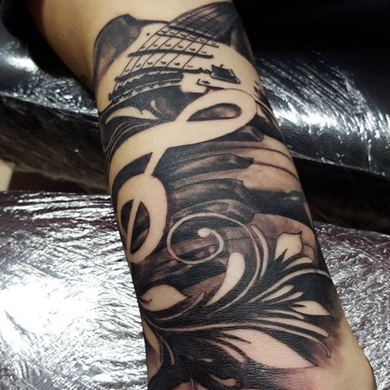 Les hommes qui choisissent le tatouage de la clé de sol pour eux-mêmes sont susceptibles d'être directement liés à la musique. Les représentants du sexe fort choisissent principalement des esquisses sans ajouts, l’exception pouvant être l’image de l’instrument. En ce qui concerne la palette de couleurs, les hommes préfèrent de plus en plus un tatouage en clé triple, fabriqué en noir avec un style simple et concis. Mais le tatouage d’une clé de sol, réalisé dans le style de l’aquarelle, avec des ajouts petits mais lumineux sous la forme d’une étoile, de notes ou d’un ornement original inhabituel, sera également magnifique et courageux sur le corps d’un homme.
