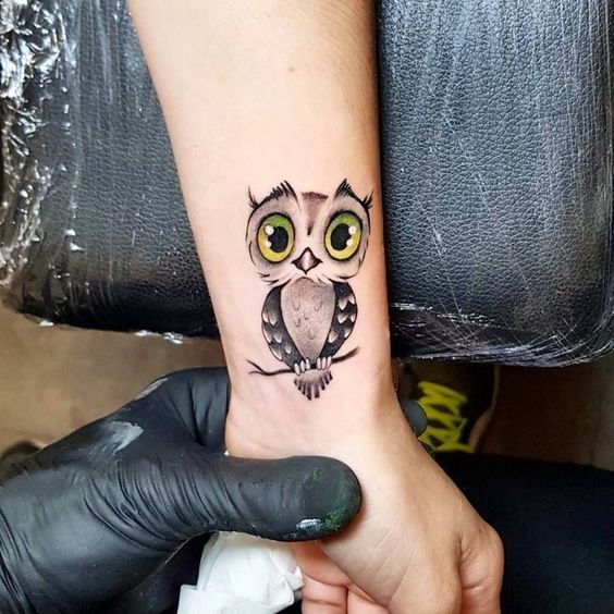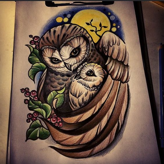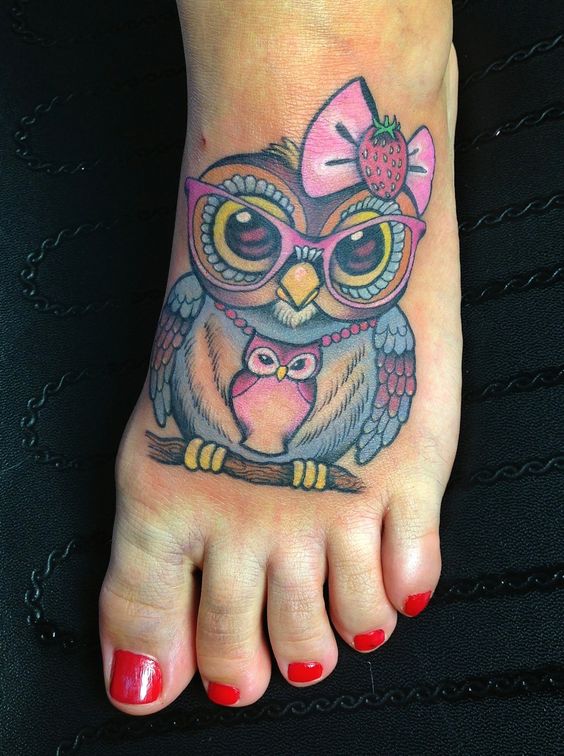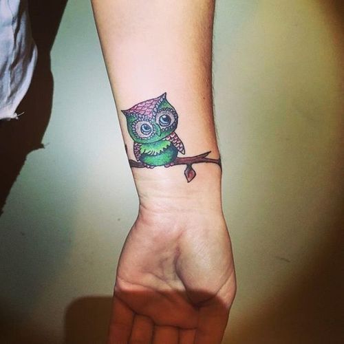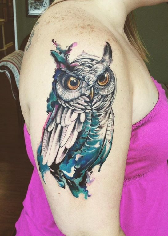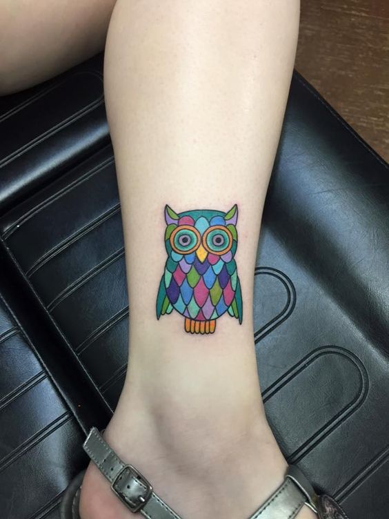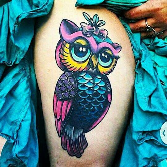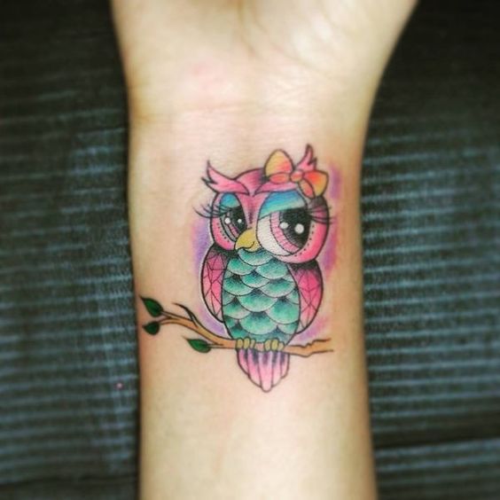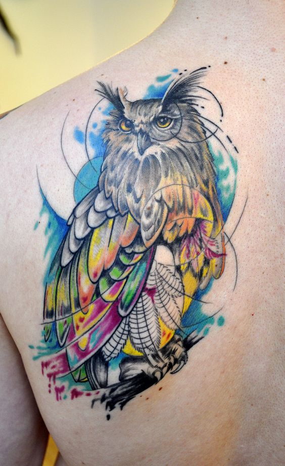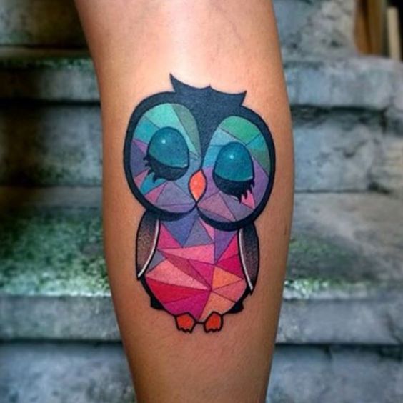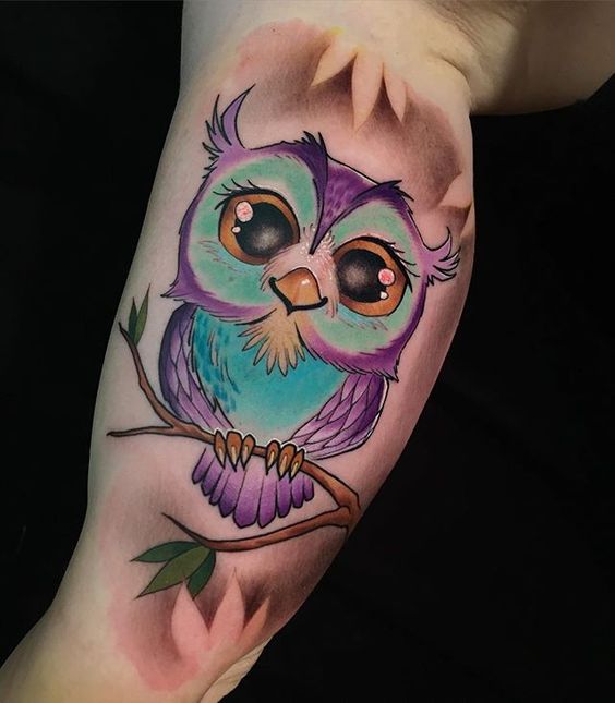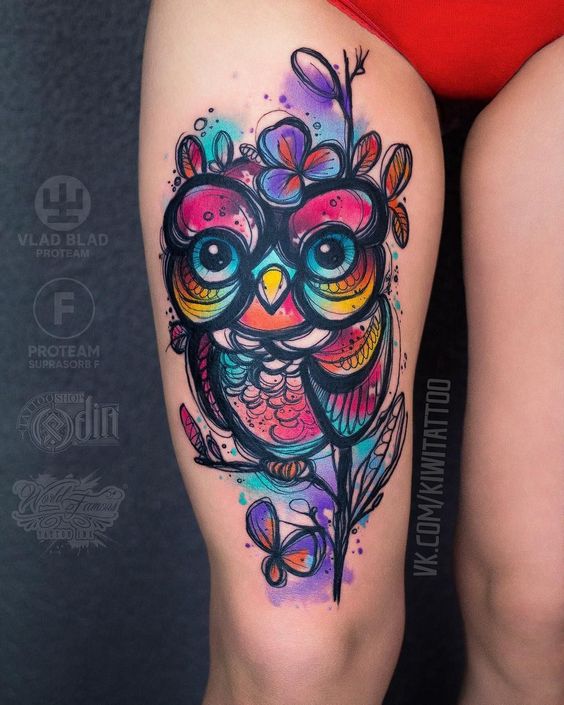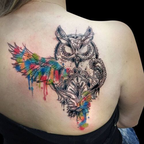 Le mystère du tatouage en forme de hibou est associé non seulement à son exécution à l'encre noire, car les dessins en couleur sur le corps portent également un certain mystère. Le tatouage de hibou n'est pas toujours réaliste. Très souvent, les personnes gaies choisissent des variantes de couleur fabuleuses d’un tatouage sous la forme d’un bel oiseau. Les bandes dessinées de tatouages indiquent une attitude positive envers la vie et les difficultés sociales.