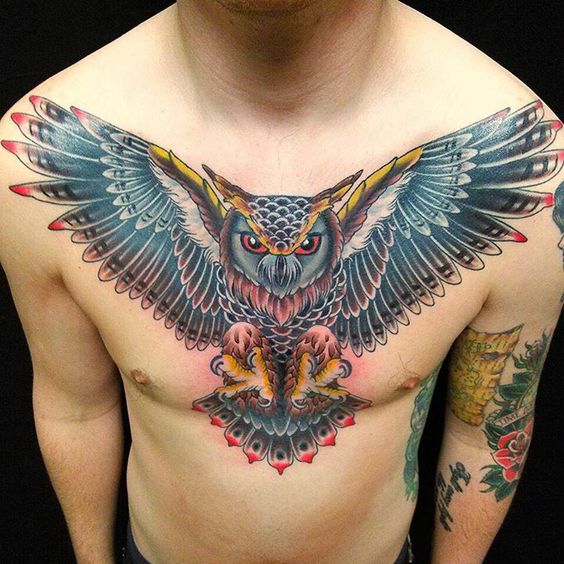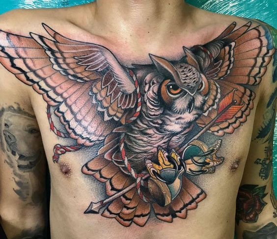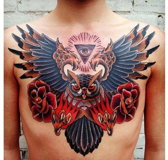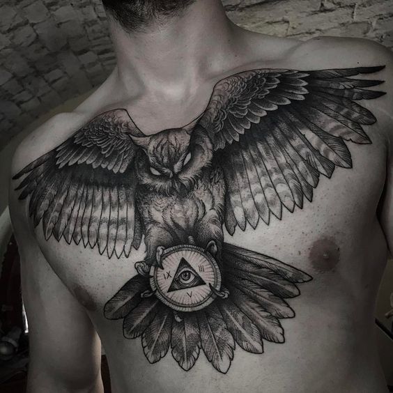 Tatouage de hibou sur la poitrine: exemples uniques sur la photo