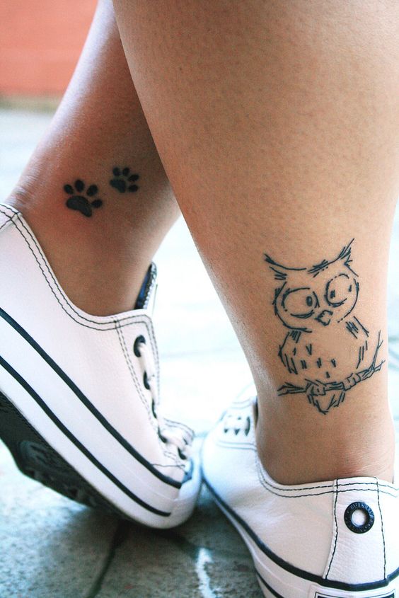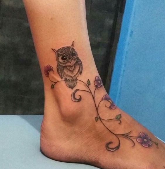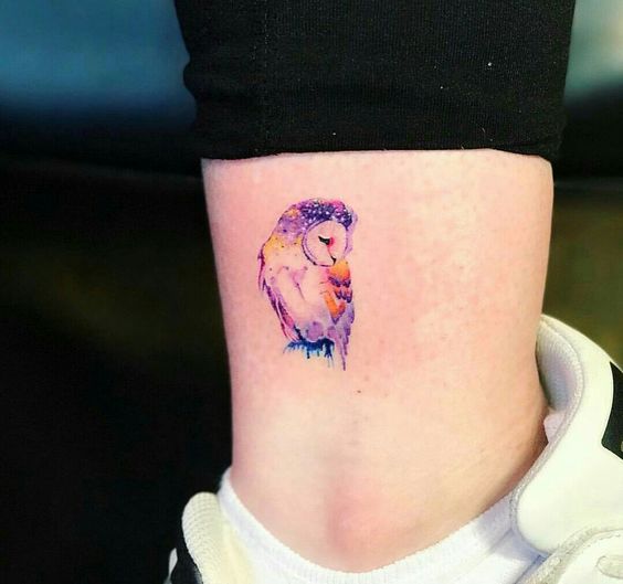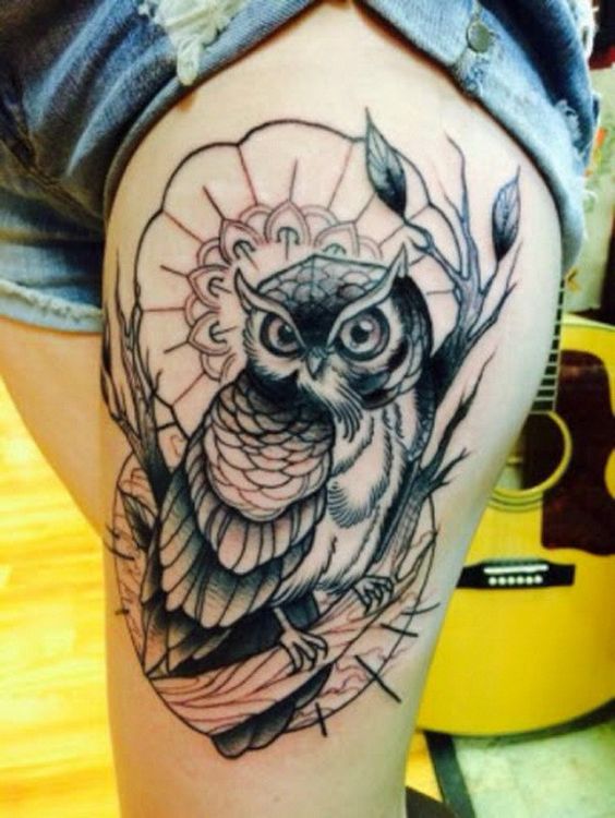 Les tatouages de hibou sur la jambe féminine sont très souvent effectués sur la face antérieure de la cuisse. De telles compositions ont l’air assez ambitieuses et tentent donc de les jouer en couleur. Mais même au niveau du mollet, de la cheville, de la jambe et du pied, les tatouages de hiboux colorés sont incomparables et originaux. Les hommes choisissent rarement leurs pieds comme endroit où placer le mystérieux oiseau.