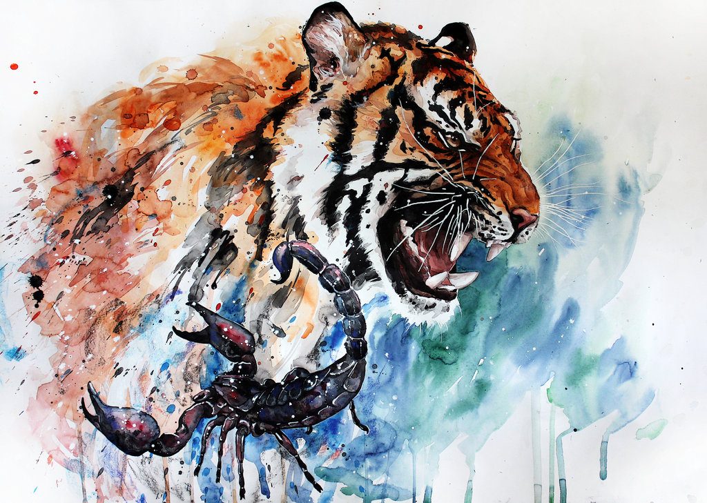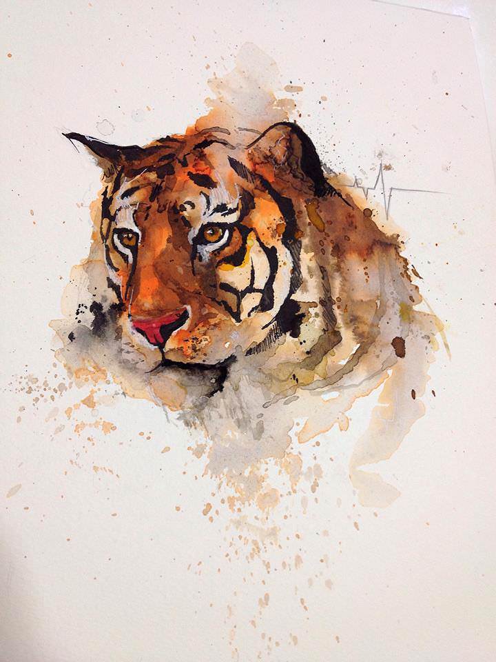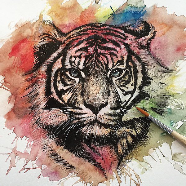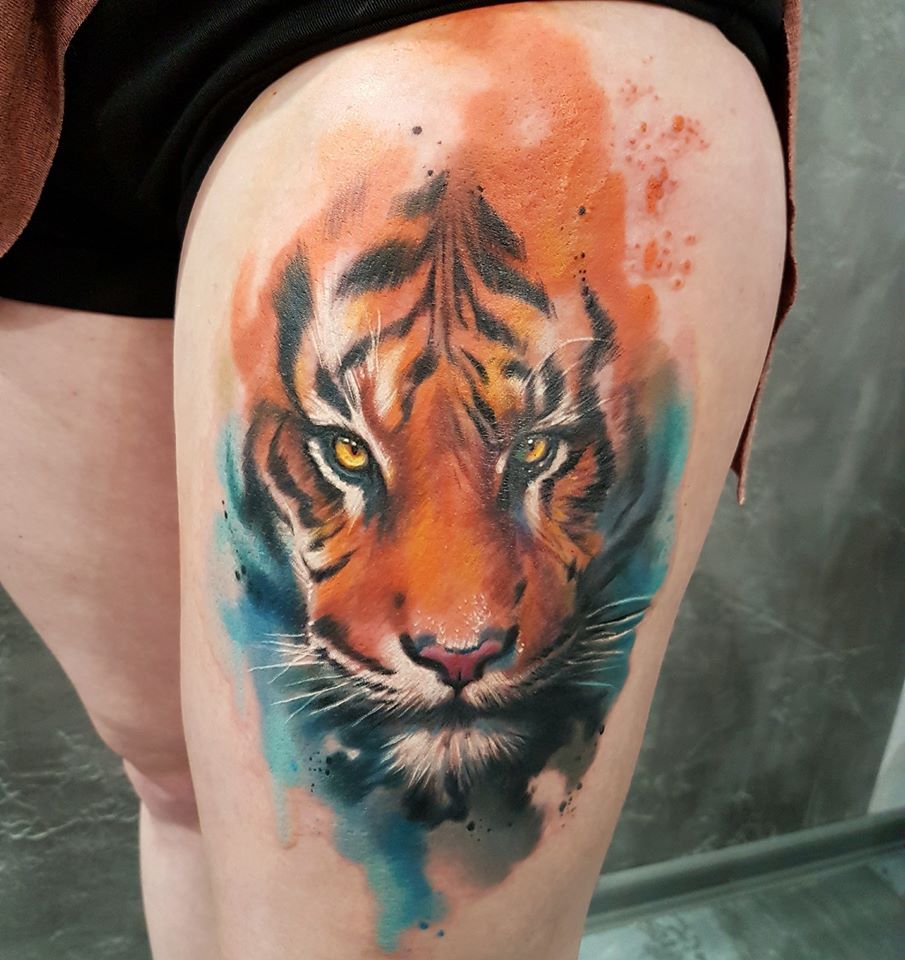 De nombreux maîtres exécutent leur travail en utilisant des techniques d'aquarelle, car avec cette option, il est préférable de transmettre les couleurs riches et les émotions de la photo. Par exemple, un tatouage de tigre est effectué dans les tons orange. Ainsi, non seulement la couleur de l'animal lui-même est transmise, mais également la splendeur de l'ornement. Une nuance orange vif entrecoupée de couleur noire met parfaitement en valeur l'image d'un personnage décisif et caractéristique.