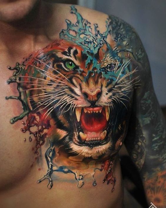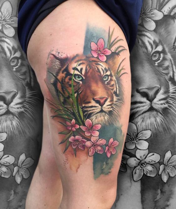 Chaque personne a son propre point de vue sur les tatouages. Quelqu'un aime les tatouages en noir et blanc, et quelqu'un préfère les jolis dessins colorés. Par conséquent, les maîtres des salons de tatouage proposent de faire des tatouages en forme de tigre sur des arrière-plans colorés qui serviront d'excellente décoration. Par exemple, des nuances de terre et de ciel (fond vert et bleu) ou d'ornement floral.