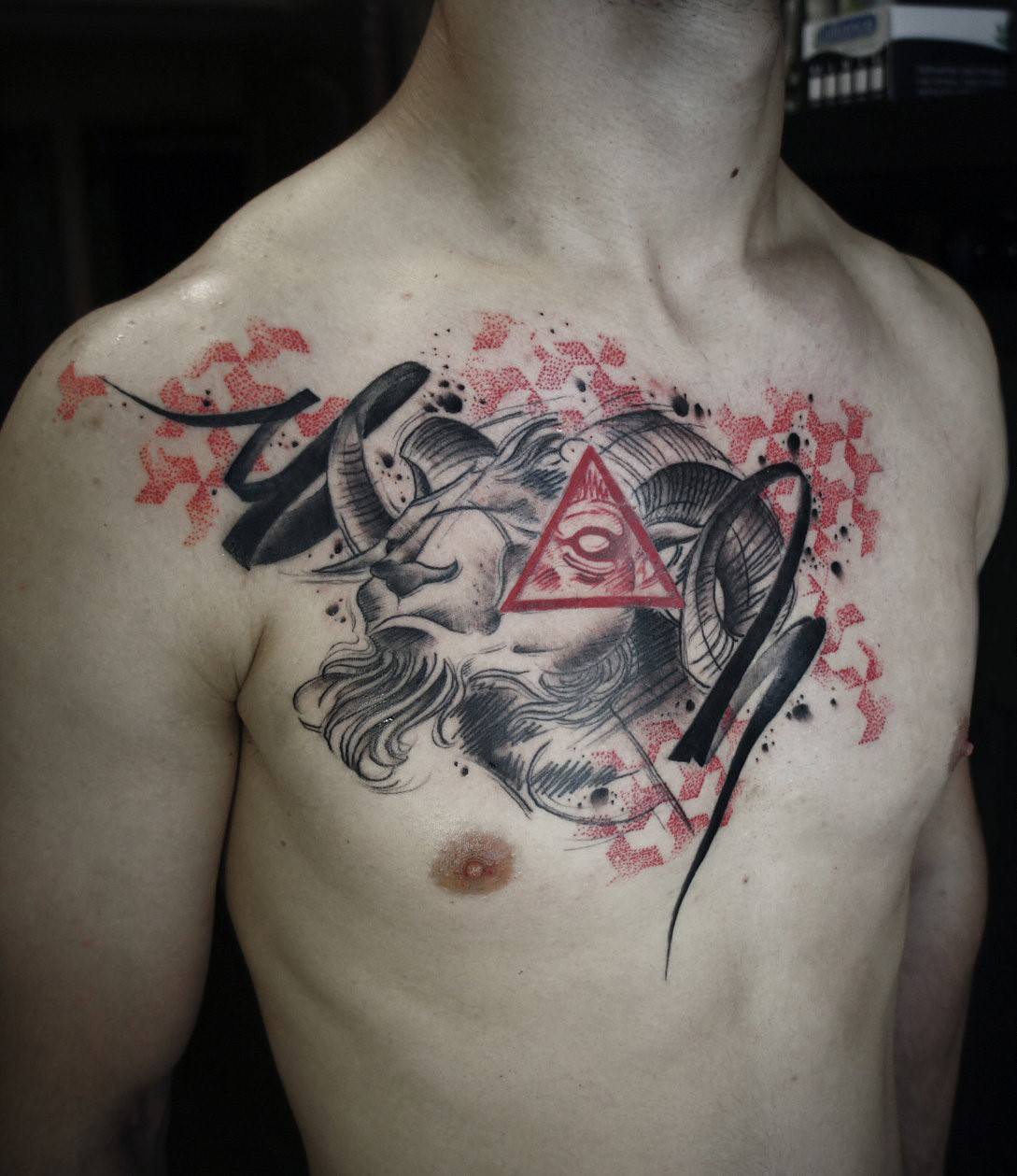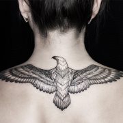 Une option tout aussi populaire est un tatouage sur le dos ou la poitrine. Dans ce cas, les dessins sont toujours volumineux, volumineux et ont une signification particulière. Par exemple, des visages, des crânes, des oiseaux ou des animaux. Les hommes choisissent le plus souvent l'une des options présentées ou les combinent dans une esquisse.