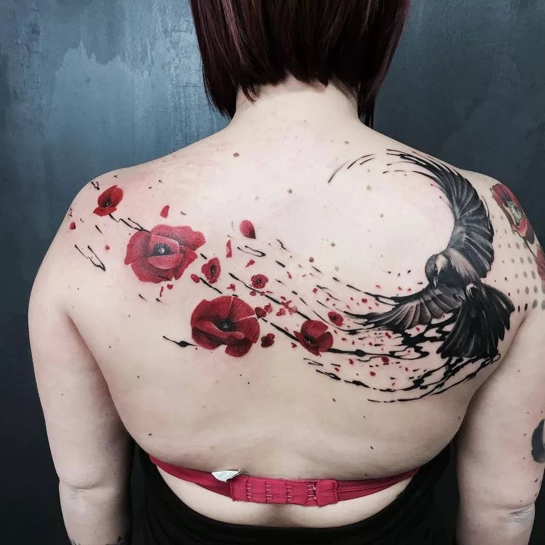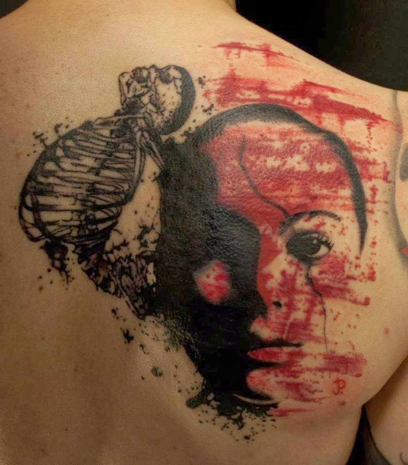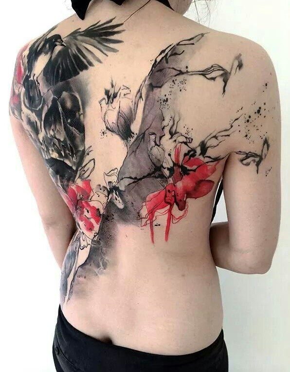 Chez les femmes, on voit de plus en plus un tatouage à la polka trash sur le dos, les côtes ou même sur le ventre. Souvent, dans ce cas, les lignes sont légèrement plus douces et les fleurs sont souvent utilisées comme décor. Ces détails aident à réduire le degré de négativité et l'esprit de protestation, ce qui peut être vu dans la figure.