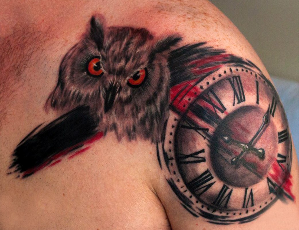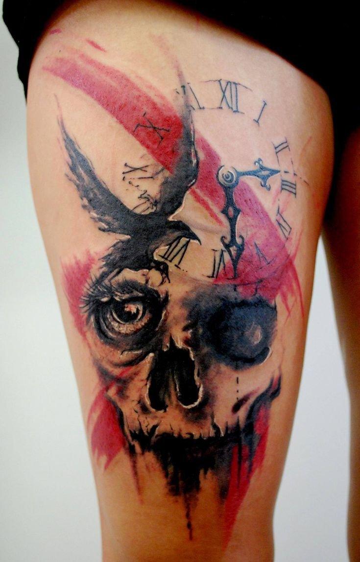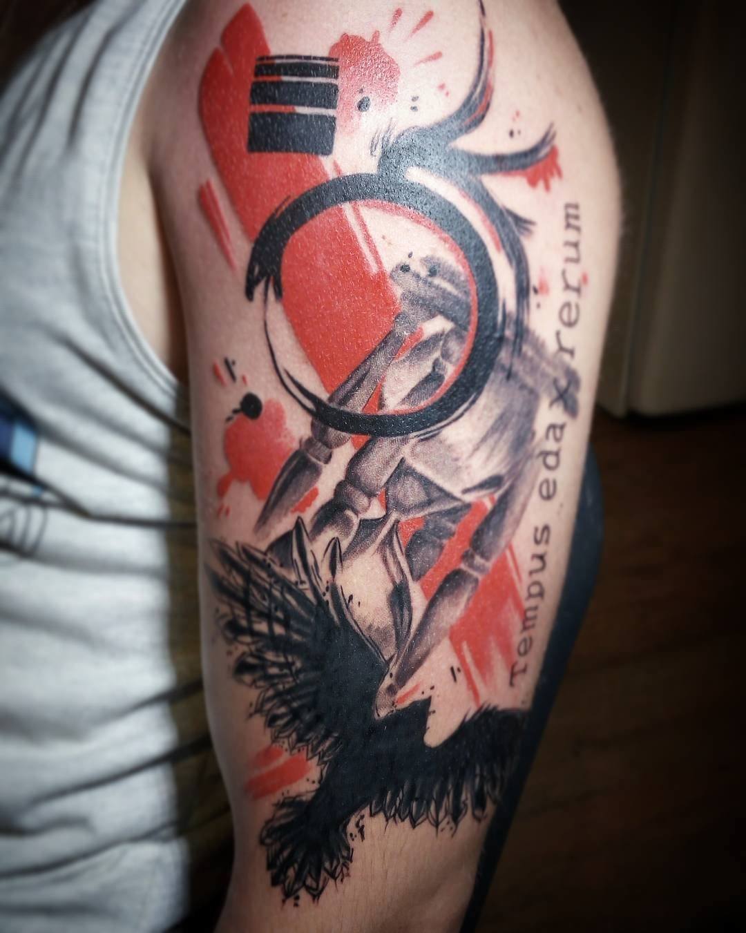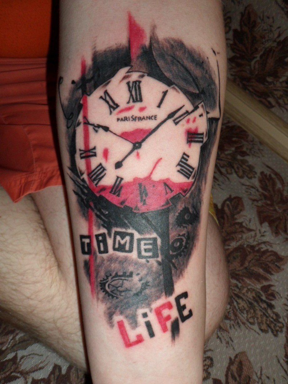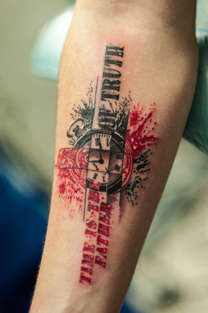 L'image de la montre est devenue très populaire dans ce style.Et nous ne parlons pas seulement de la version flèche, mais aussi d’une mécanique ou d’un sablier. Il n’est pas difficile de comprendre que le message principal est que vous devez valoriser votre temps et en disposer correctement. Après tout, la vie est fugace et finira par tout.