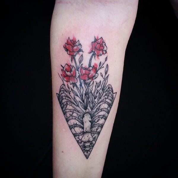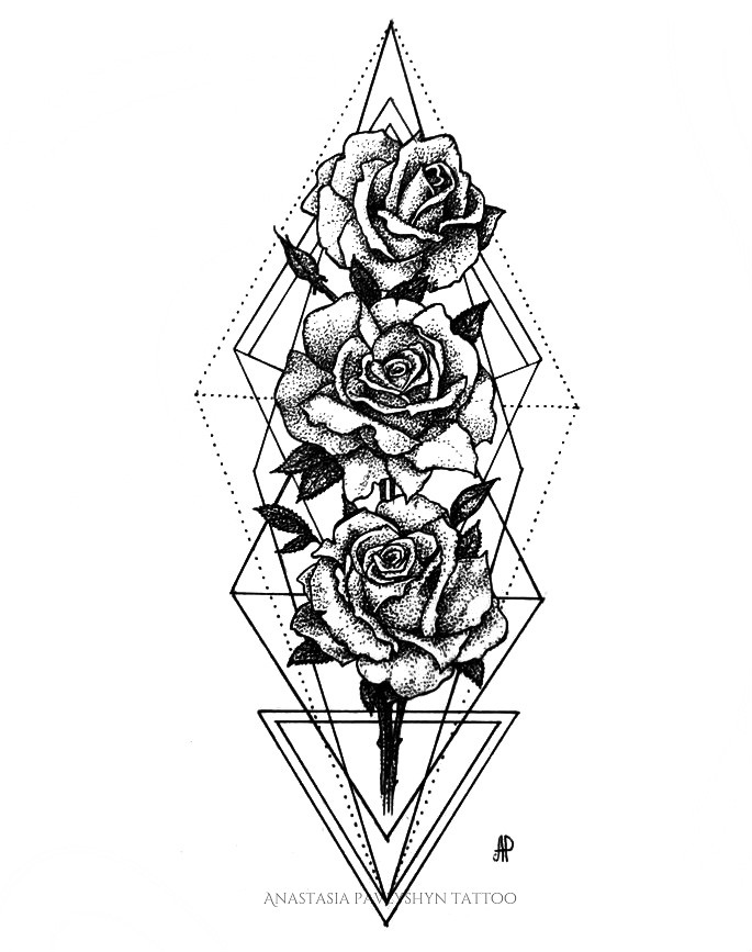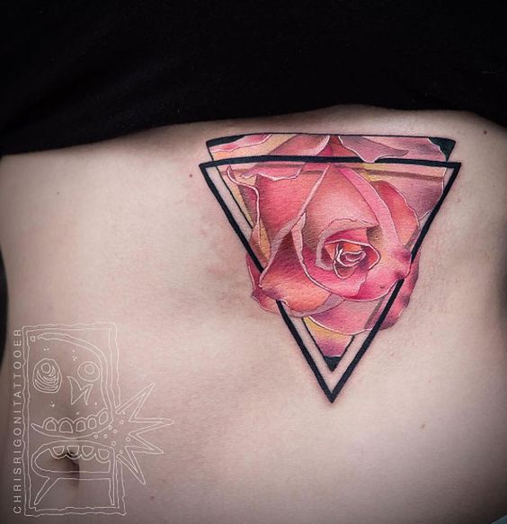 Très souvent, les filles choisissent elles-mêmes une image en forme de triangle remplie de motifs floraux. Les roses sont les plus communes d'entre elles. À l'aide d'un tatouage de rose dans un triangle, une fille se fait remarquer.Cette composition portable a fière allure dans les petits et les grands formats. L'emplacement du triangle de tatouage avec des roses peut être très différent. Tout dépend de la taille choisie. En général, la signification de la combinaison d'un triangle avec une rose est interprétée comme une énergie féminine. Le beau sexe, sur lequel on peut voir un tatouage avec une rose en combinaison avec un triangle, se distingue par une attitude particulière envers l’art, la musique et la créativité en général.