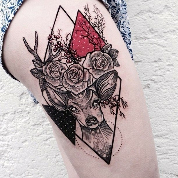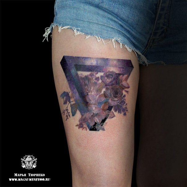 Le tatouage en triangle sur les jambes des filles a l’air intéressant et original dans n’importe quelle partie. Ils essaient de faire le tatouage plus grand sur la hanche, et des images plus minimalistes se trouvent dans la région de la cheville. Des compositions à la mode avec des triangles polyvalents et équilatéraux sur les jambes, ainsi que sur de nombreuses autres parties du corps, sont décorées d'éléments supplémentaires. Les images en couleur d'animaux, les arrangements floraux ou l'abstraction incompréhensible semblent impressionnantes sur la jambe, surtout si le tatouage est de haute qualité et de bon goût.