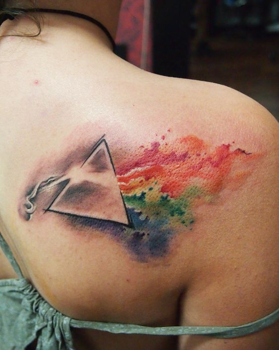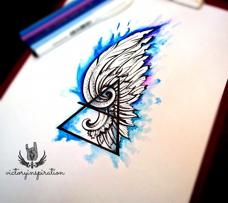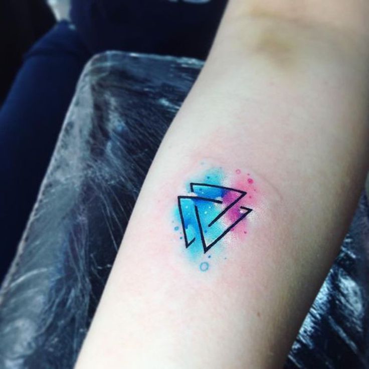 La plupart des tatouages avec un triangle sur le bras sont à l'encre de couleur. Le tatouage en forme de triangle en aquarelle est particulièrement impressionnant aux poignets. La conception inhabituelle du corps convient aux filles qui ne perdent pas courage dans la vie, mais essaient de tout voir à travers un prisme multicolore du bonheur. Si nous parlons de la version noire du tatouage sur le bras, le triangle de ce format a l’air soigné, ce qui, dans tous les cas, est déjà considéré à la mode.