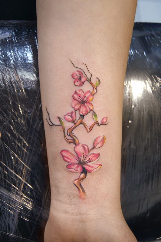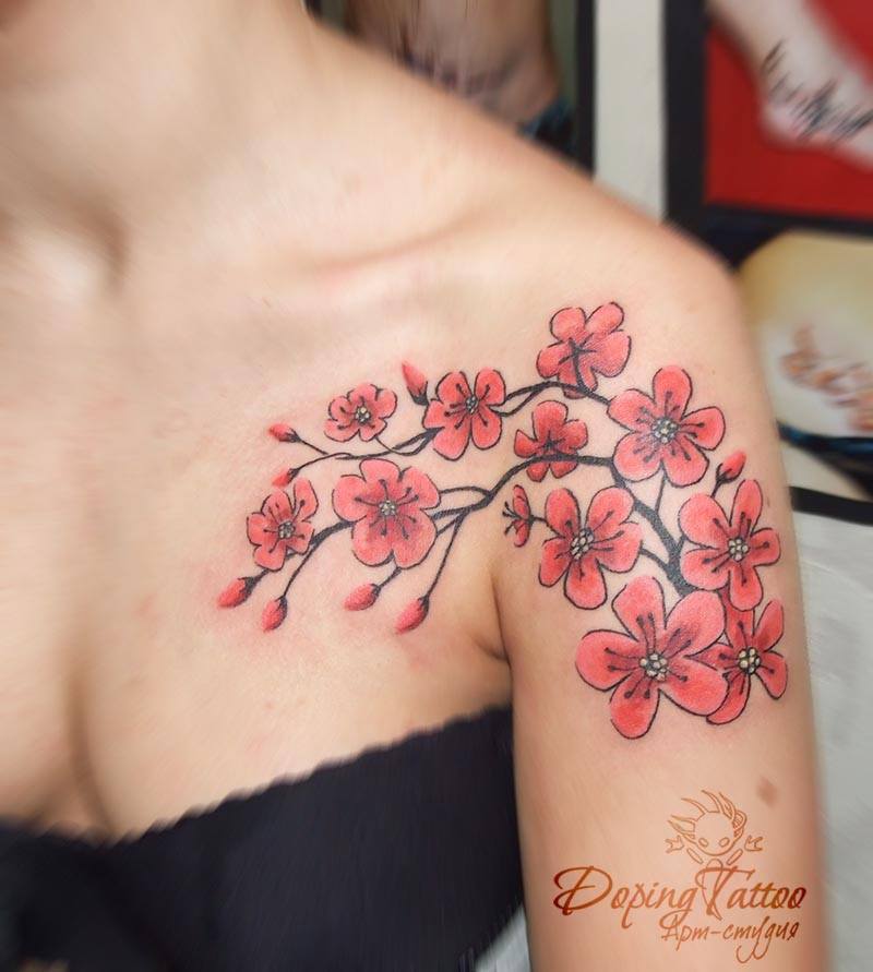Un tatouage avec une image de branche de sakura a plusieurs significations et symbolise le chemin de la vie et son début, le désir de changer de vie, les affaires et l'amour de l'aube, le bien-être et le bonheur. Très souvent, les filles choisissent un tel tatouage en raison de la beauté et de la tendresse des fleurs de sakura à la cerise japonaise. Le dos est l’endroit le plus populaire pour appliquer un tatouage de branche de sakura. Mais une telle brindille aura fière allure sur n'importe quelle partie du corps. Si vous souhaitez créer une petite image, appliquez une branche de sakura à votre poignet ou à votre avant-bras. Souvent, un tel tatouage est appliqué derrière l'oreille ou sous la clavicule.