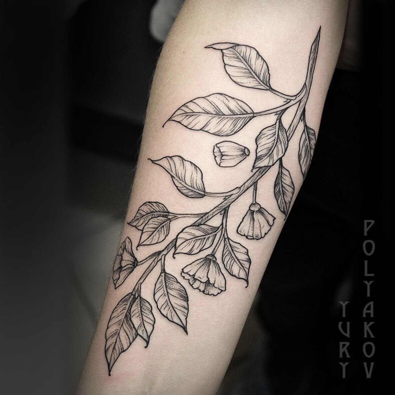 Branche de tatouage: signification, croquis, exemples de photo avec sakura, olive, lilas, cendre de montagne et autres plantes