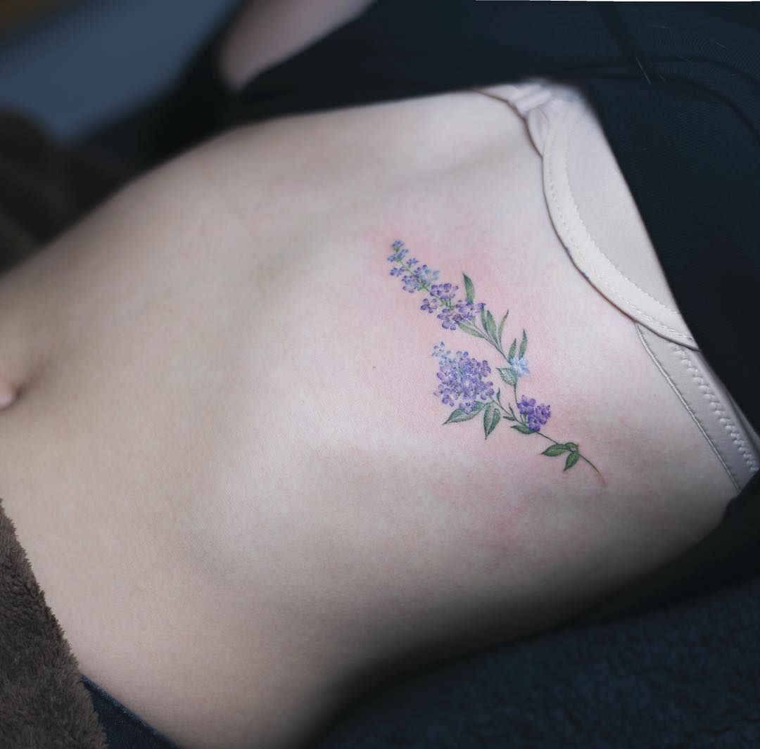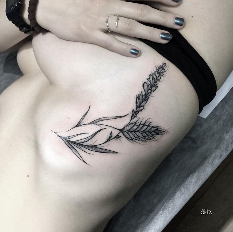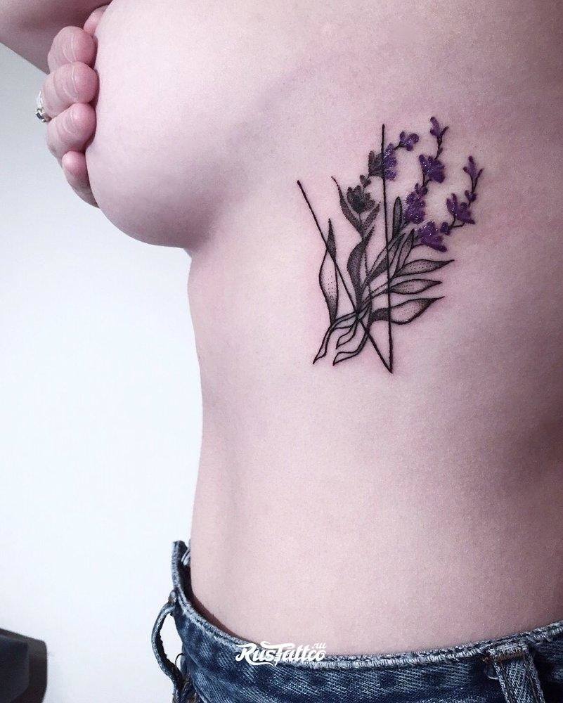 Les filles adorent décorer leur corps avec des tatouages représentant une branche de lavande. Cette fleur délicate appliquée sur le corps a le sens de fragilité et de féminité, de longévité et de santé. On pense également qu'un tatouage à la lavande aide à la recherche de sa seconde moitié. L'image la plus caractéristique et la plus populaire d'une branche de lavande est un groupe de branches fines et délicates.Le dessin est allongé, avec de longues lignes, ce tatouage est donc appliqué sur les omoplates, les côtés, les bras ou les jambes.