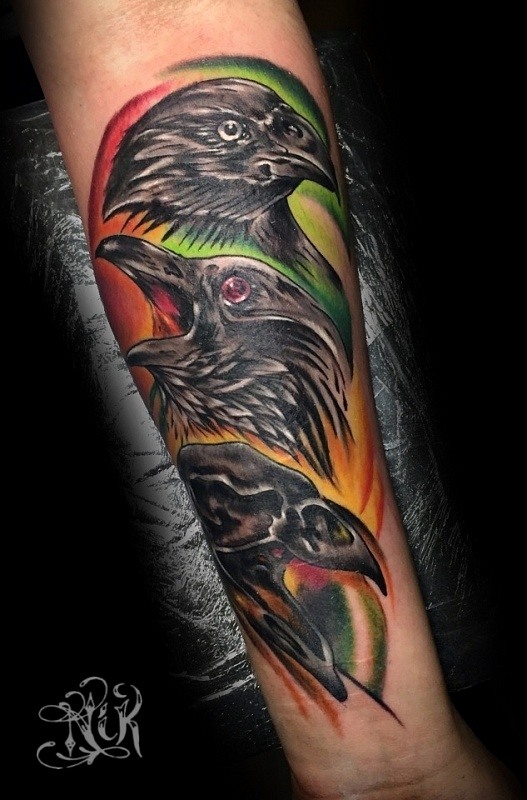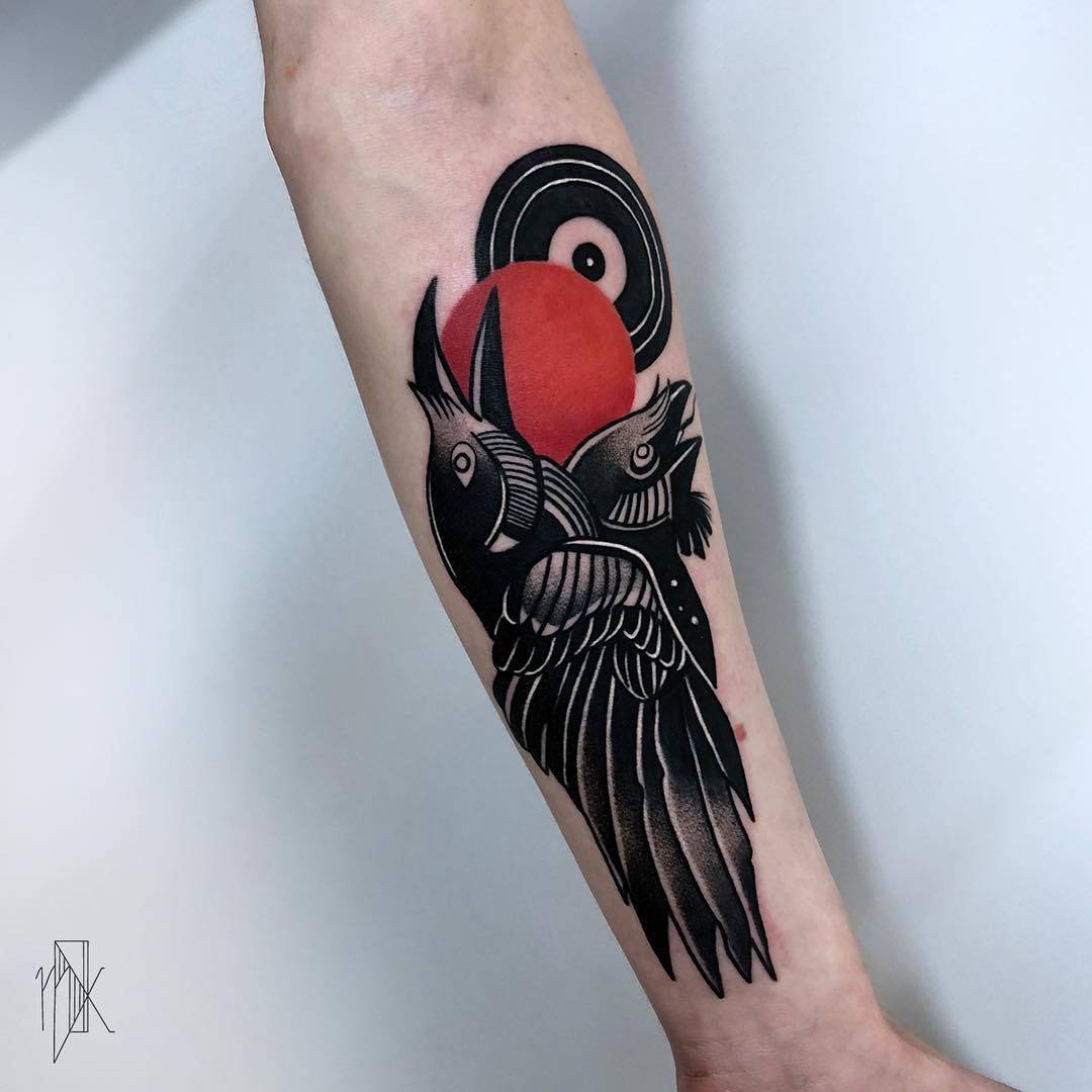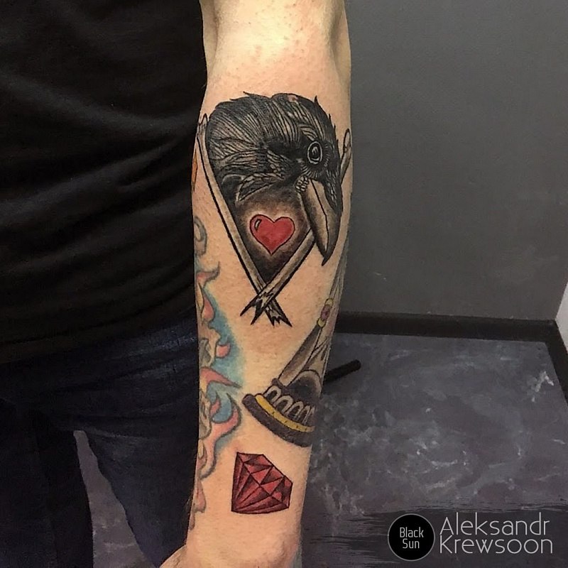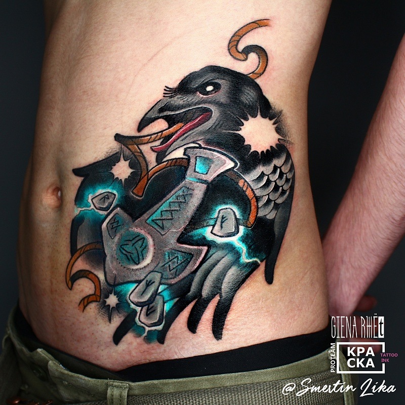 Dans le monde des tatouages, l'image d'un corbeau peut avoir différentes significations. Ces tatouages ont été utilisés par les Grecs et les Celtes. Un tatouage en forme de corbeau représentait presque toujours l'énergie éolienne, la sagesse et la longévité. Parmi les Japonais, cet oiseau symbolisait une famille heureuse, les Égyptiens, au contraire, considéraient le corbeau comme un oiseau du mal, de la destruction et du chaos. Des tribus africaines adoraient cet oiseau, le qualifiant de guide, et tuer un corbeau signifiait jeter un sort sur toute la tribu. Dans le christianisme, le corbeau est ambigu. D'un côté, un corbeau noir est un oiseau aux pouvoirs ténébreux, et de l'autre, un corbeau a sauvé le prophète Elijah de la famine. La solitude et la sagesse sont un autre sens du tatouage de corbeau. Aujourd'hui, le tatouage en plumes de corbeau est devenu un symbole du rock. Ce tatouage est appliqué sur le dos ou l'épaule.
