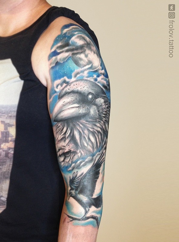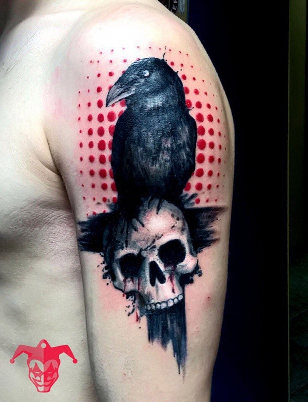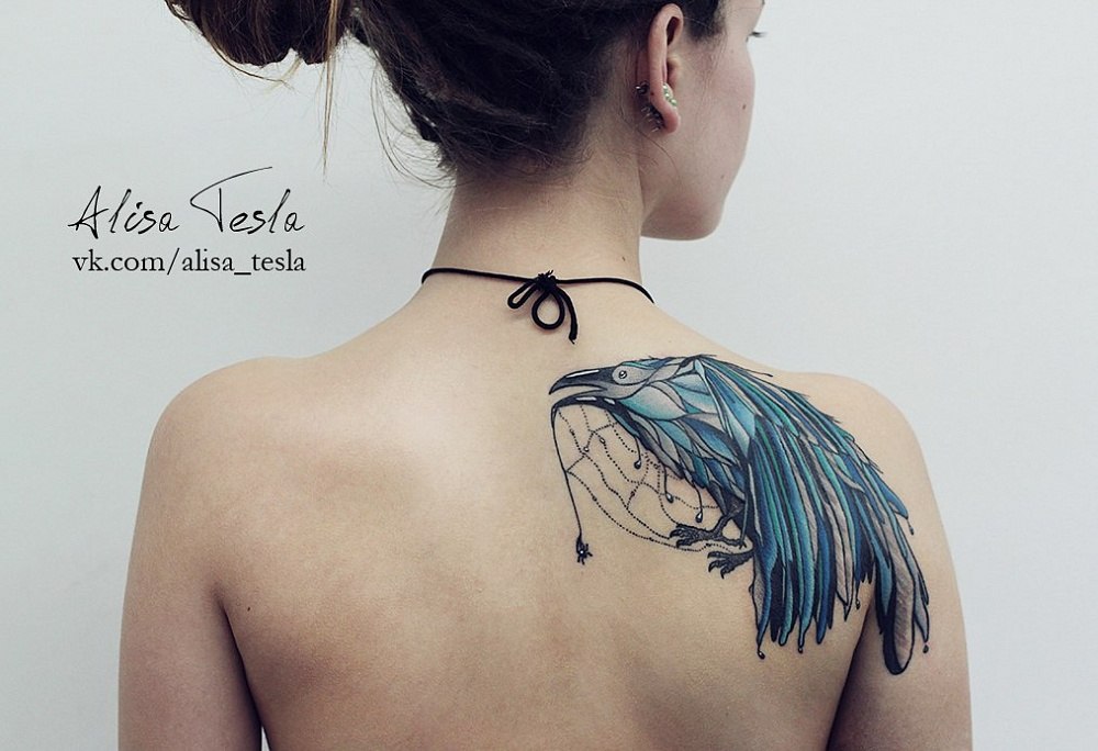 L'épaule est un autre endroit populaire pour les tatouages corbeau. Bien sûr, la zone est petite, mais un tatouage avec une petite image aura fière allure ici. Très souvent, un tatouage de corbeau sur l'épaule peut être trouvé chez les femmes d'âges différents. Ce n'est pas pour rien qu'ils disent que chaque femme est une petite sorcière dans son âme.