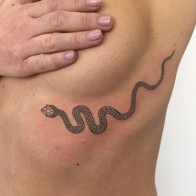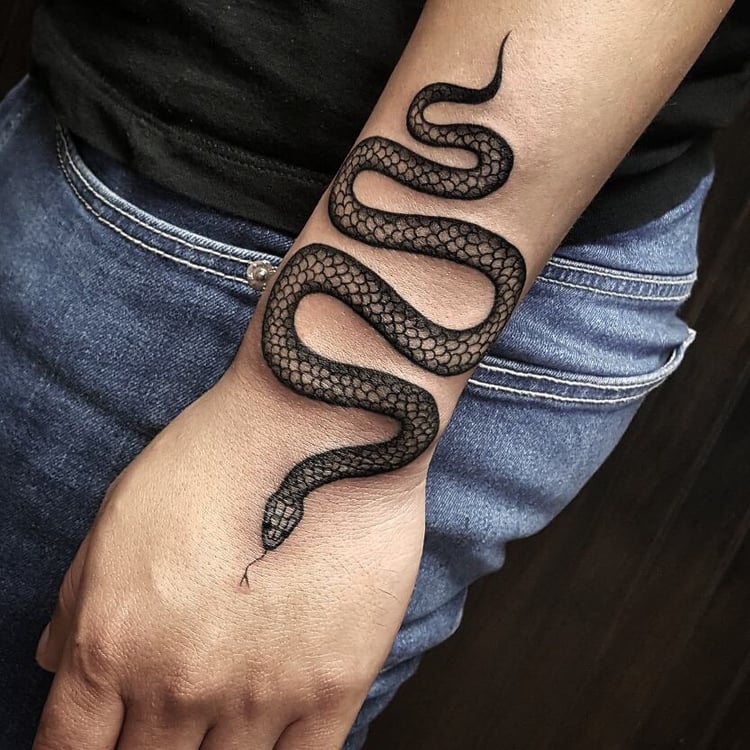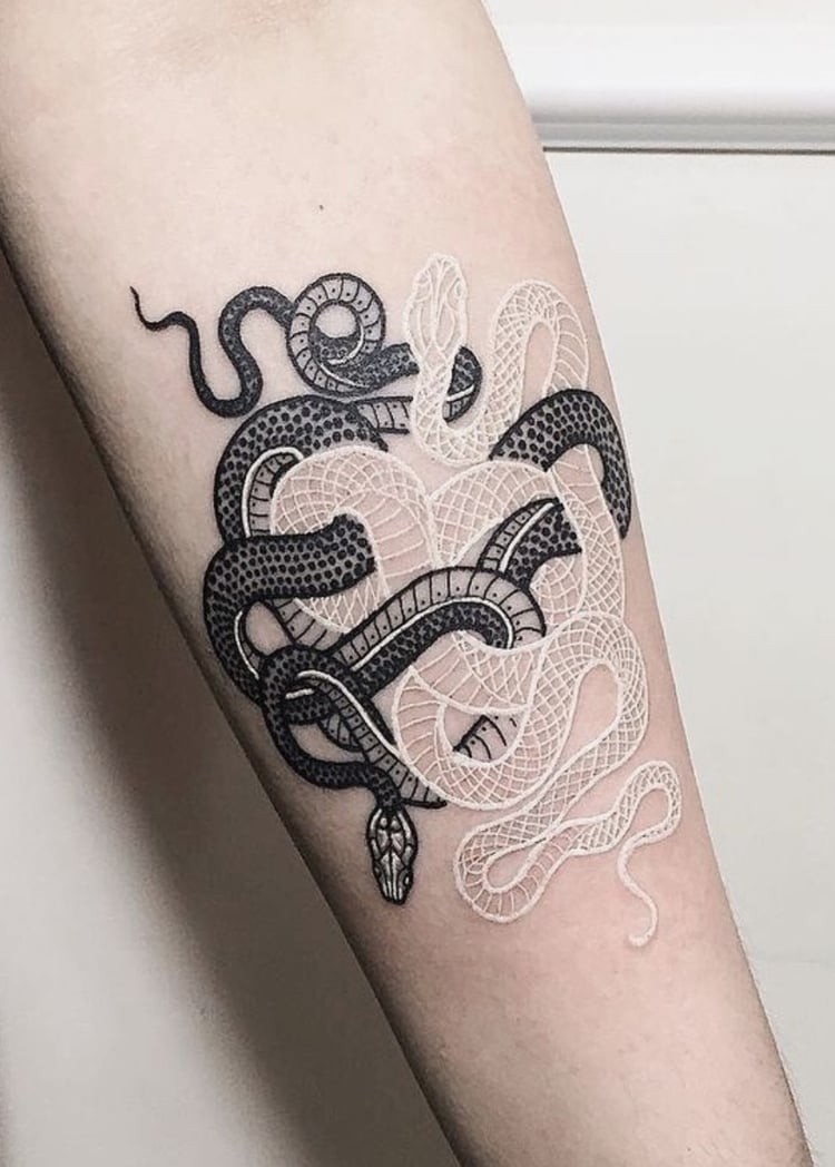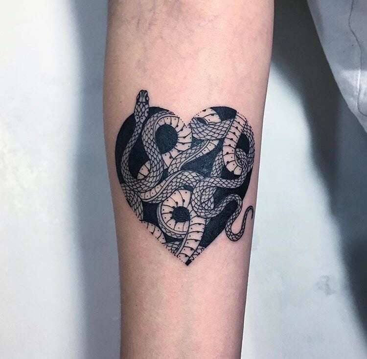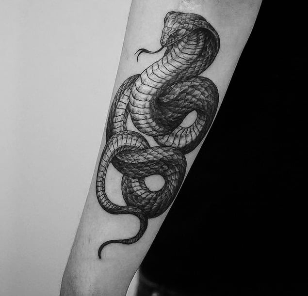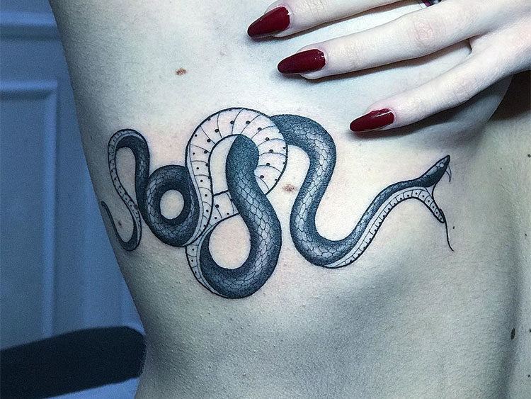 Le tatouage du serpent noir indique que son propriétaire a traversé un certain nombre de difficultés extrêmement difficiles, par exemple une maladie, mais a réussi à vaincre toutes les épreuves. Très souvent, un tatouage de serpent noir orne le bras et est réalisé dans un format minimaliste. Certains exemples de tatouages de serpent en noir semblent beaucoup plus réalistes qu'en couleur.