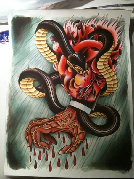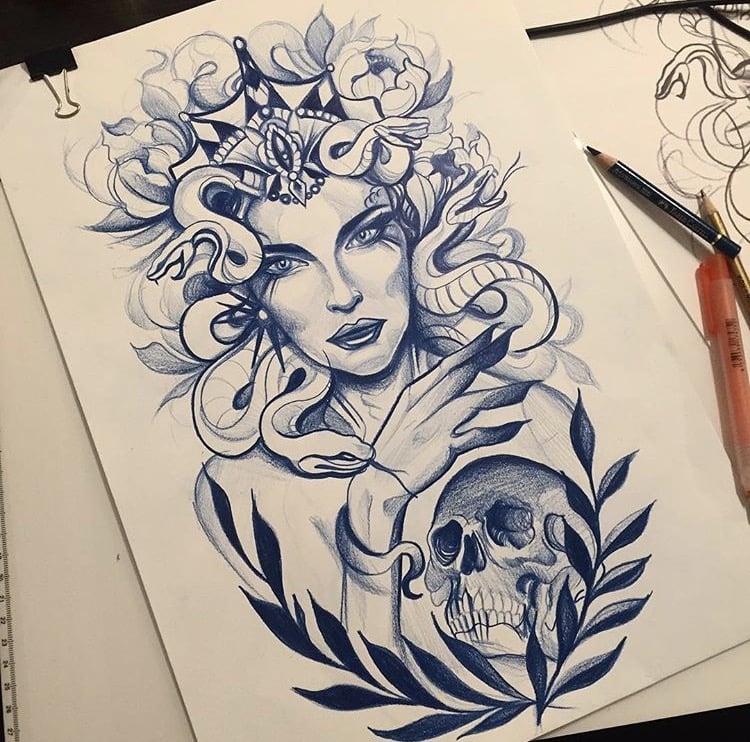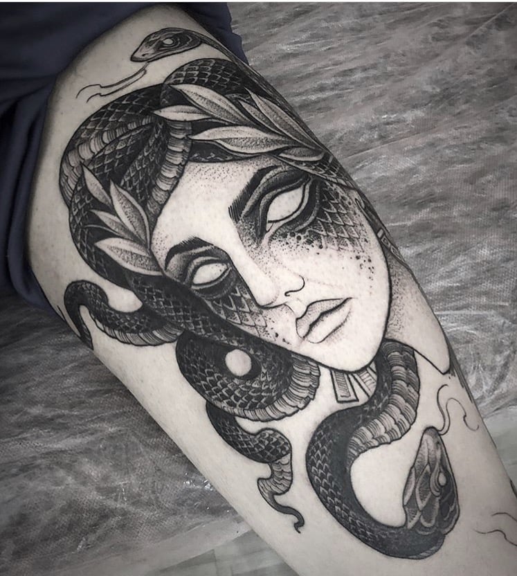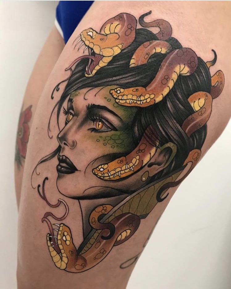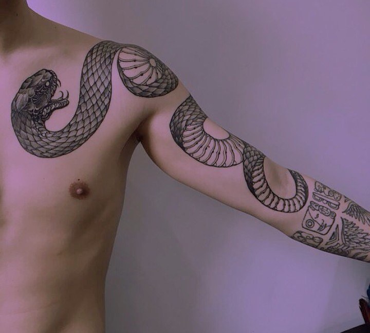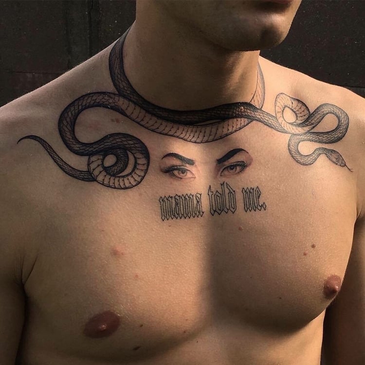 En dépit de certaines agressions dans le comportement de nombreux serpents, les hommes préfèrent utiliser son image comme dessin principal dans la composition corporelle globale. Souvent, vous pouvez voir sur le corps masculin un serpent rampant à travers un crâne humain. Une autre option masculine populaire était l'image de la méduse Gorgon, dans laquelle les cheveux sont des serpents.