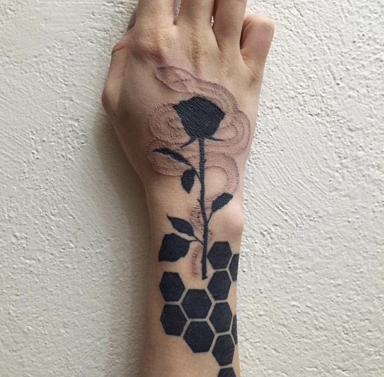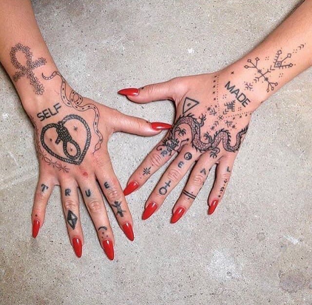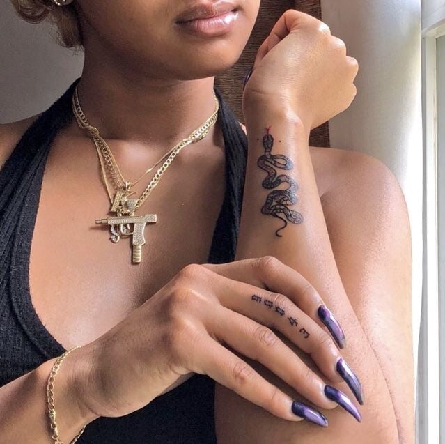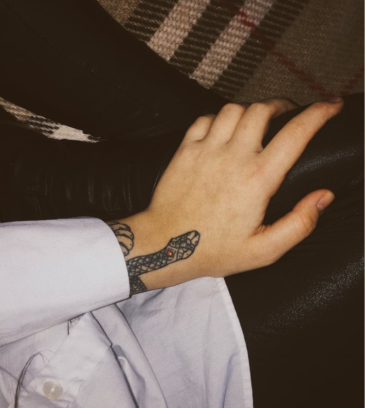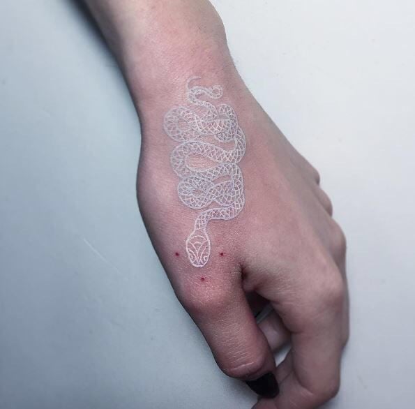 Il y a très souvent sur les mains des serpents miniatures à l'encre blanche ou rouge. Cette conception portable semble incroyable. Les femmes et les hommes peuvent se le permettre. Souvent, le tatouage sur le bras n'est pas complété par des bijoux supplémentaires, car le serpent lui-même est superbe.
