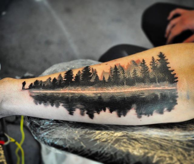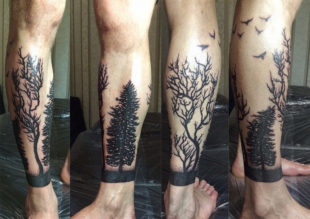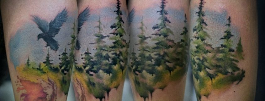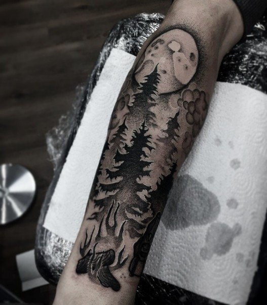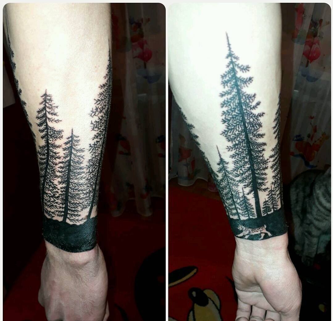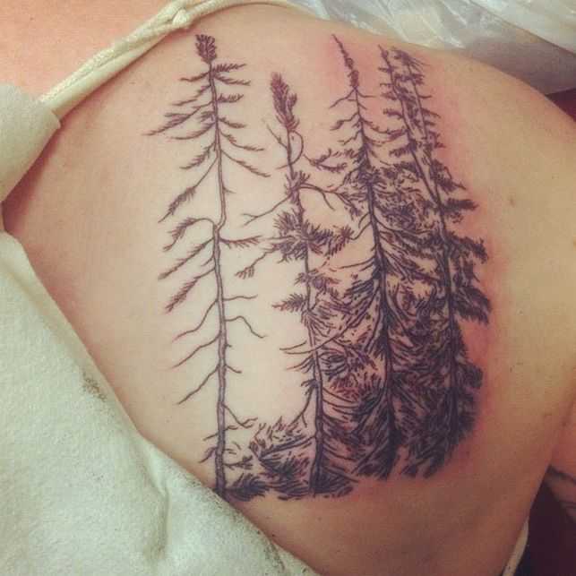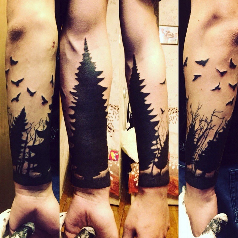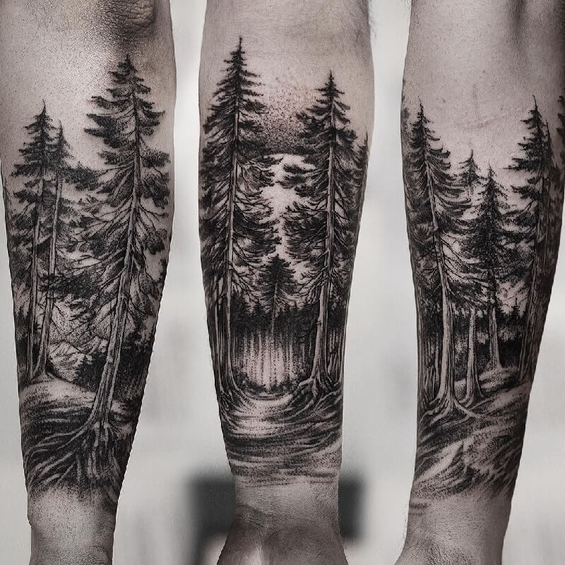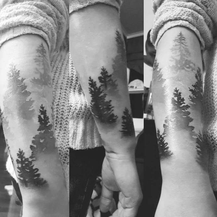 Le tatouage avec l'image de la forêt est principalement appliqué sous la forme d'un paysage réaliste, comme si une belle image était appliquée sur le corps. En règle générale, ces tatouages sont volumineux et prennent beaucoup de place, ils sont donc appliqués sur le dos, la poitrine ou le bras en entier. Un tatouage d'une forêt parmi un grand nombre d'arbres révélera l'indépendance et la maturité d'une personne. Mais si vous décidez de diversifier l'image de la forêt et de la compléter avec certains de ses habitants, vous devez étudier en profondeur leur signification, leur origine mythologique et leur symbolisme. Pour de nombreux peuples, les images d'animaux ou d'esprits inhabituels vivant dans la forêt sont prises très au sérieux.
