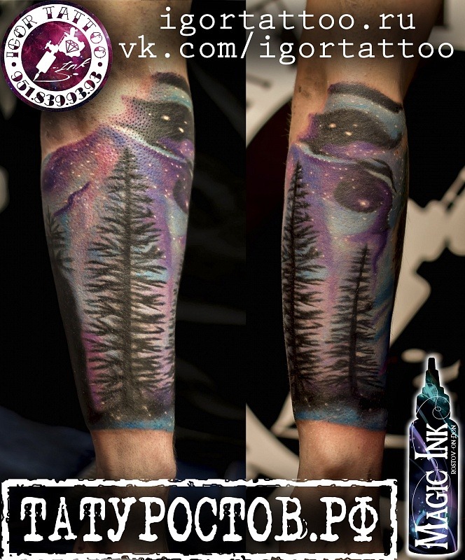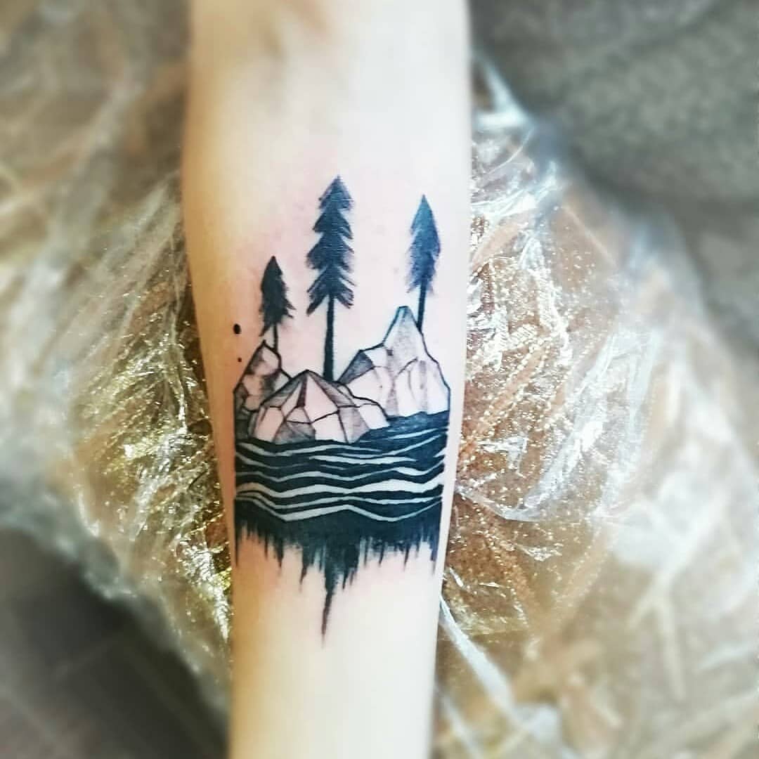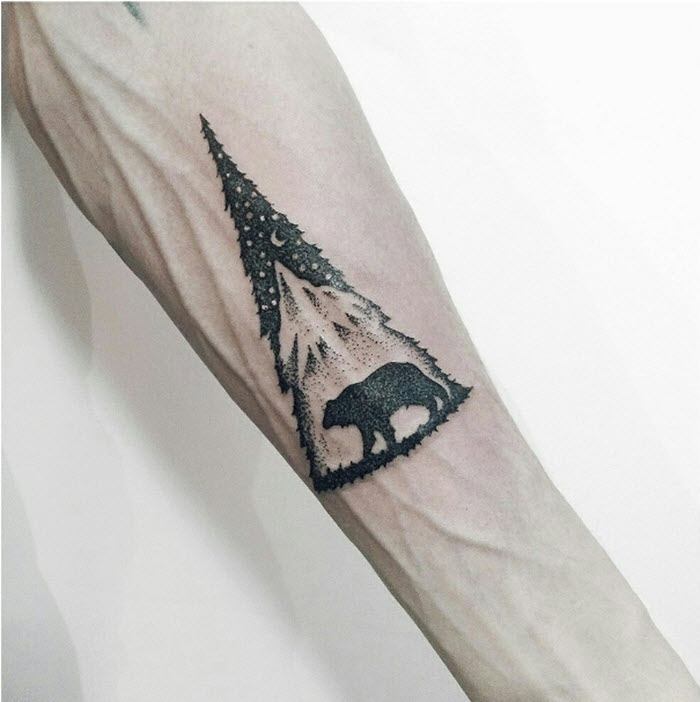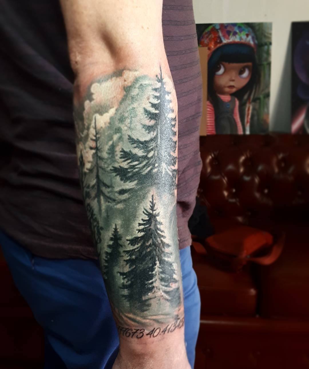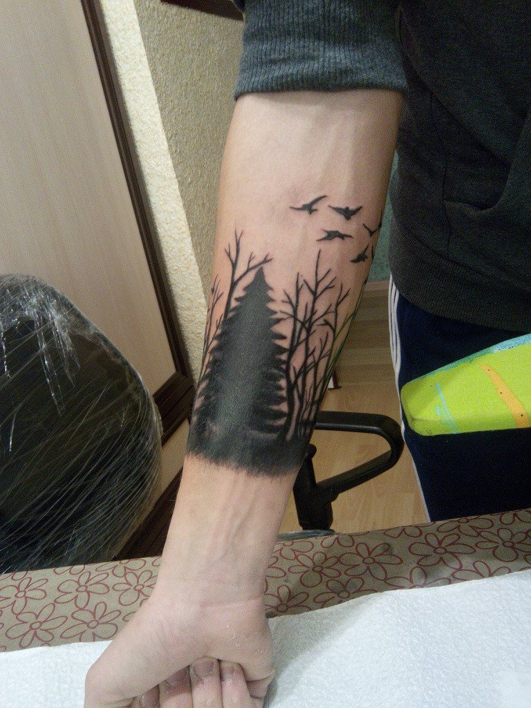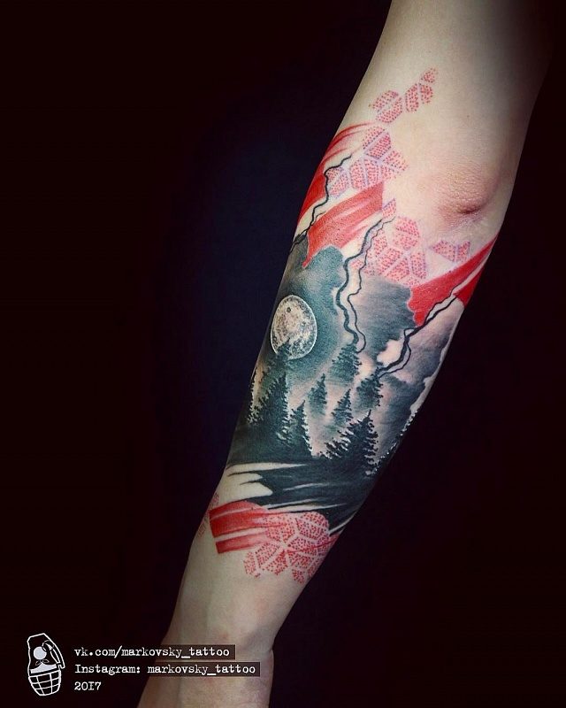 Le tatouage avec l'image de la forêt est principalement appliqué sous la forme d'un paysage réaliste, comme si une belle image était appliquée sur le corps. En règle générale, ces tatouages sont volumineux et prennent beaucoup de place, ils sont donc appliqués sur le dos, la poitrine ou le bras en entier. Un tatouage d'une forêt parmi un grand nombre d'arbres révélera l'indépendance et la maturité d'une personne. Mais si vous décidez de diversifier l'image de la forêt et de la compléter avec certains de ses habitants, vous devez étudier en profondeur leur signification, leur origine mythologique et leur symbolisme. Pour de nombreux peuples, les images d'animaux ou d'esprits inhabituels vivant dans la forêt sont prises très au sérieux.