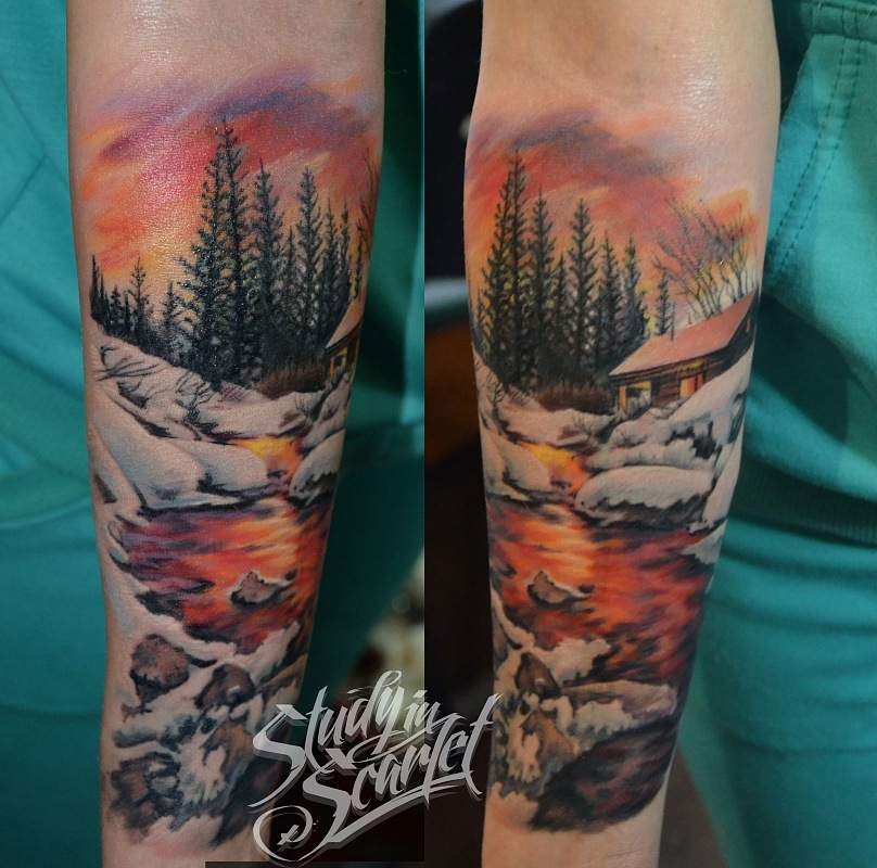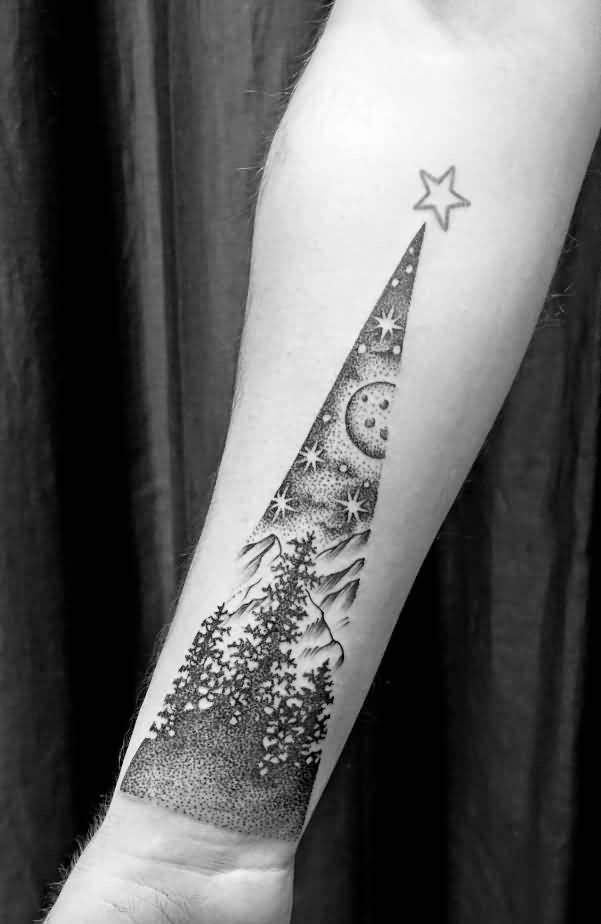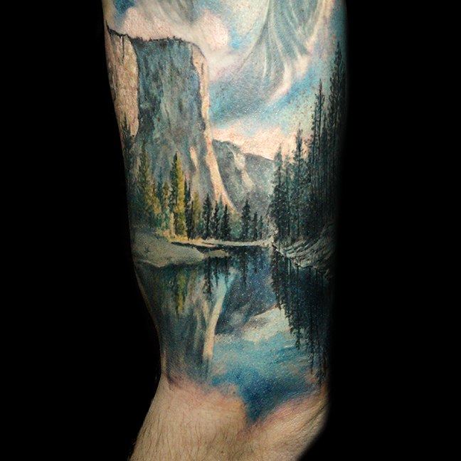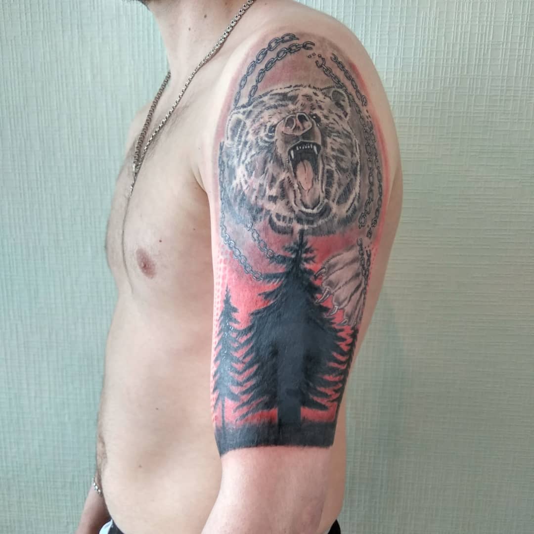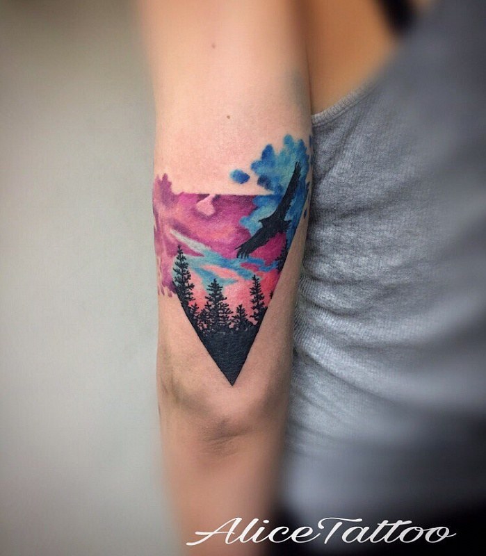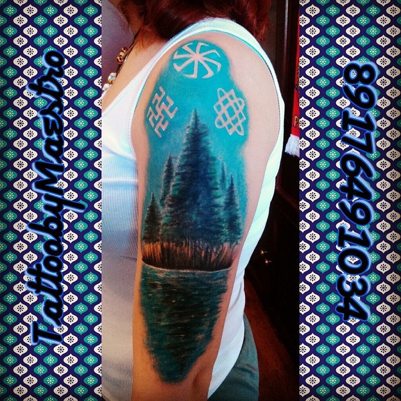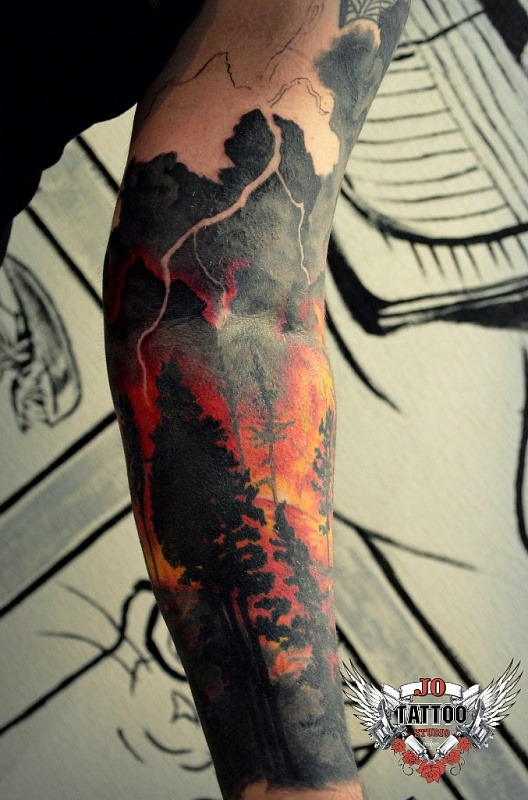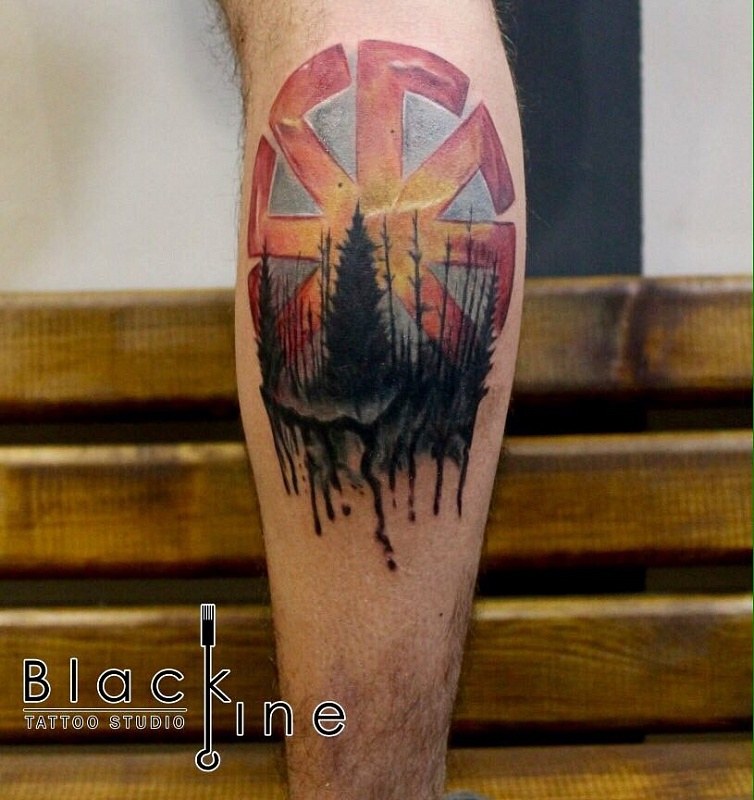 Le tatouage avec l'image de la forêt est principalement appliqué sous la forme d'un paysage réaliste, comme si une belle image était appliquée sur le corps. En règle générale, ces tatouages sont volumineux et prennent beaucoup de place, ils sont donc appliqués sur le dos, la poitrine ou le bras en entier. Un tatouage d'une forêt parmi un grand nombre d'arbres révélera l'indépendance et la maturité d'une personne. Mais si vous décidez de diversifier l'image de la forêt et de la compléter avec certains de ses habitants, vous devez étudier en profondeur leur signification, leur origine mythologique et leur symbolisme. Pour de nombreux peuples, les images d'animaux ou d'esprits inhabituels vivant dans la forêt sont prises très au sérieux.