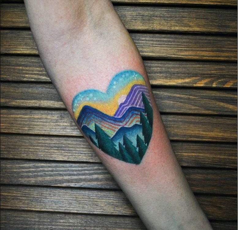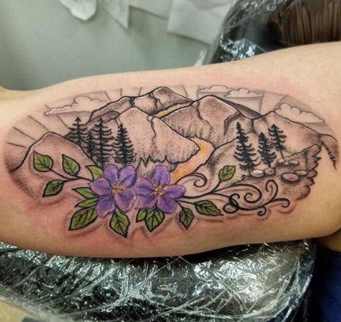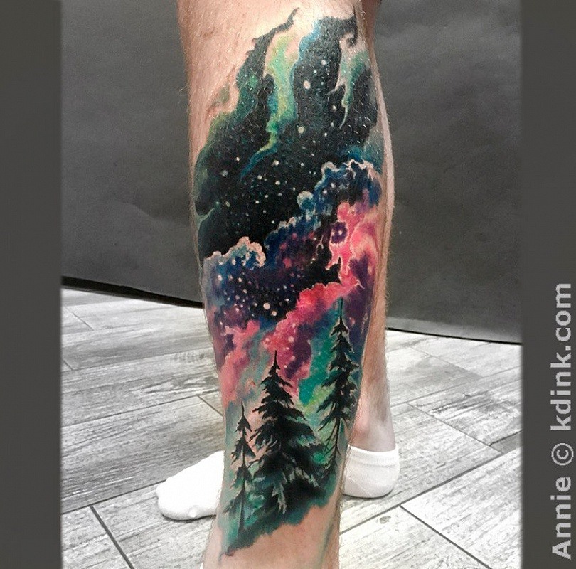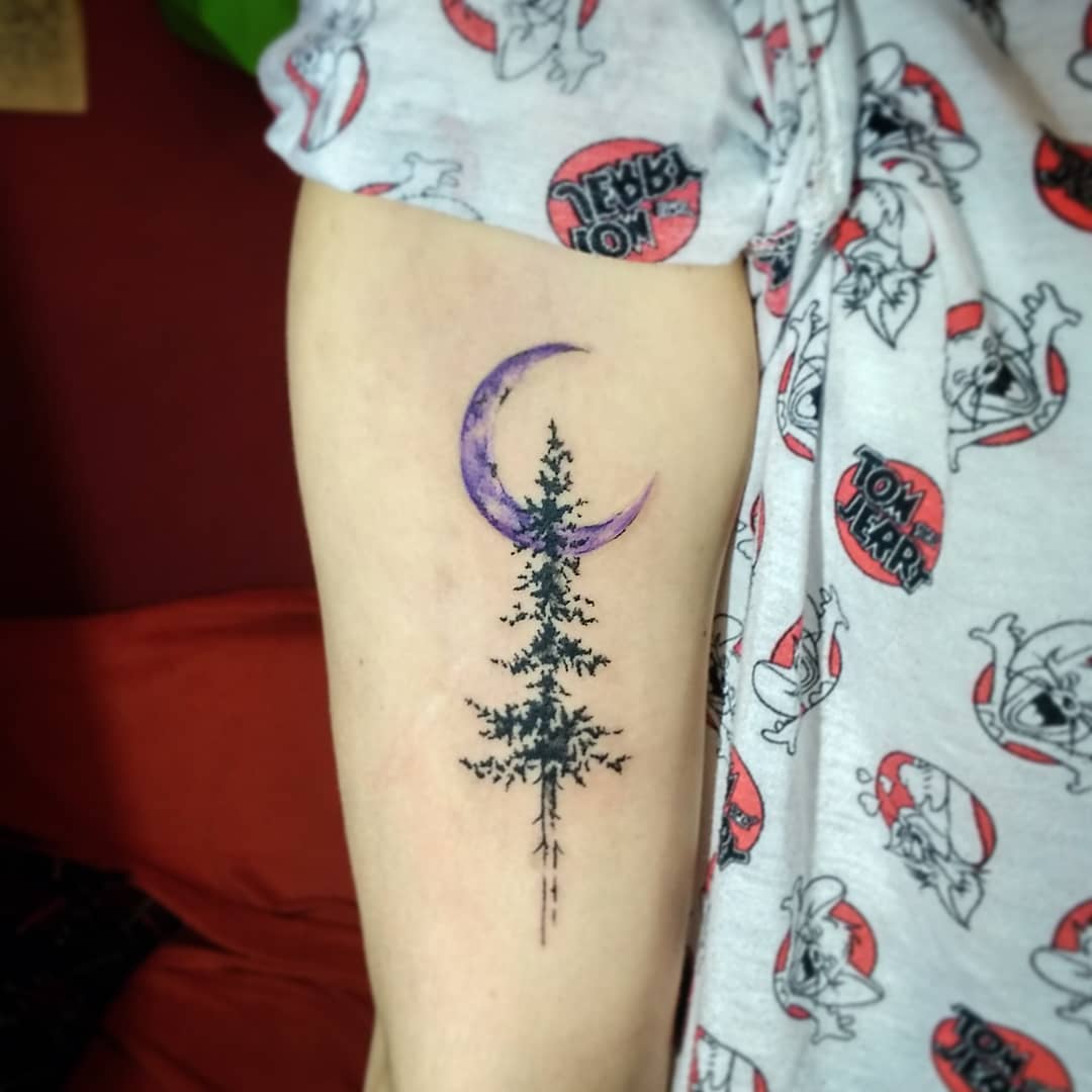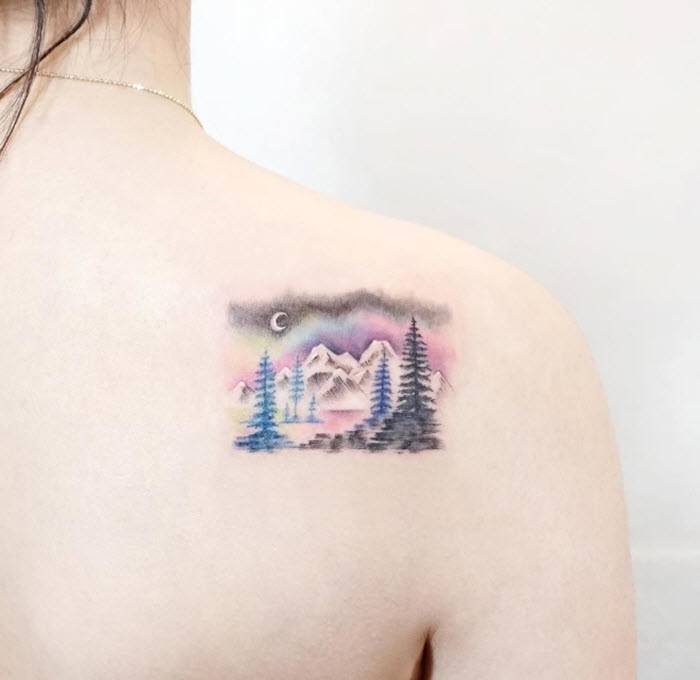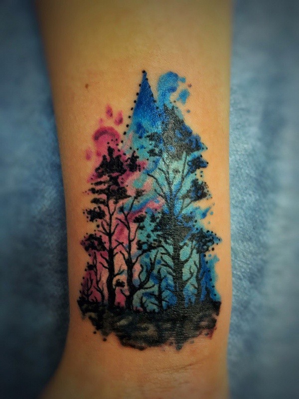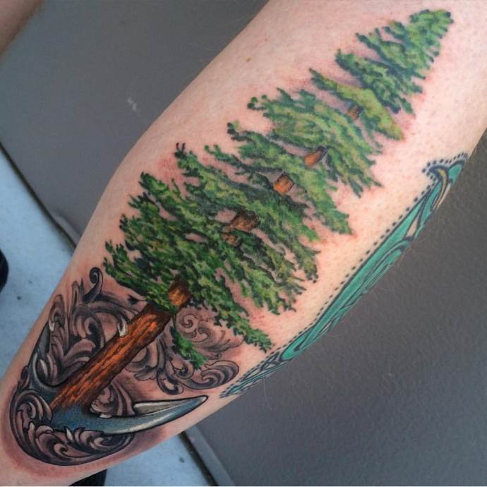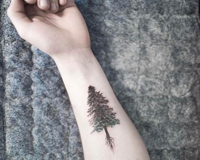 Le tatouage en épicéa de couleur est positif et attrayant, amusant et un peu vif. Un tel tatouage peut être fait sous la forme d'un seul arbre ou d'un paysage entier, s'étendant sur presque tout le corps. Une forêt d'épicéas ou un arbre solitaire entouré de rivières, de lacs ou de montagnes est très beau. Le réalisme du tatouage en épicéa sera une merveilleuse décoration du corps.