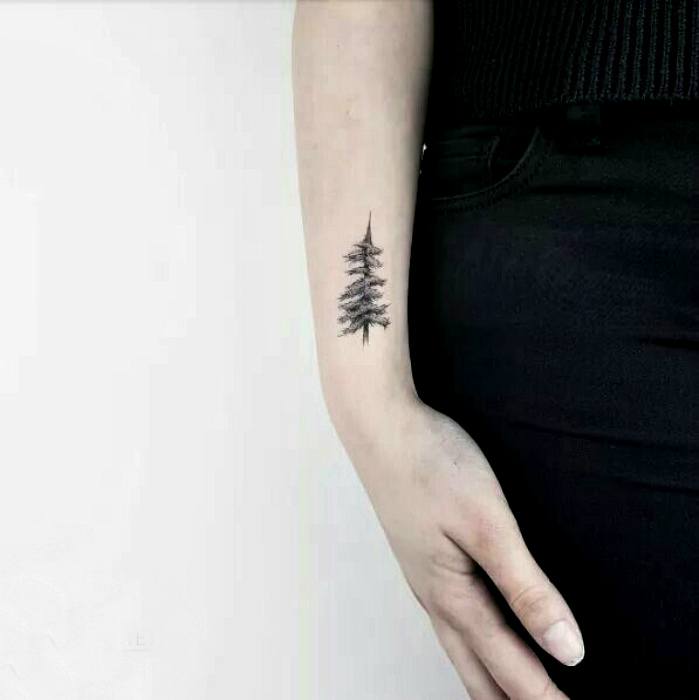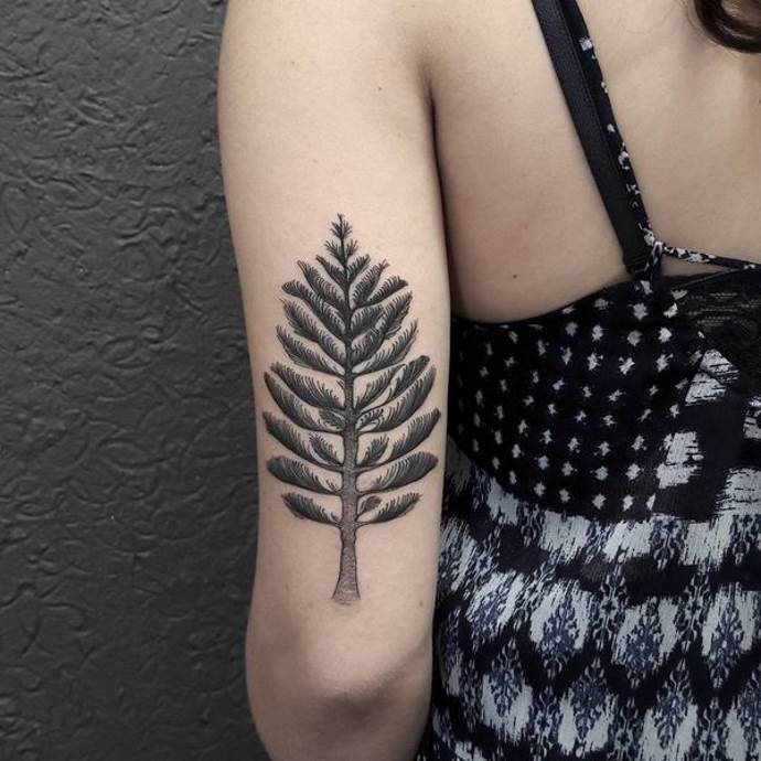 Les filles choisissent très souvent un tatouage avec l’image d’une épinette. On pense que l'image d'une branche d'arbre à feuilles persistantes ou d'épinette leur donnera le propriétaire de la tendresse. Une belle image d'épicéa témoignera de la détermination et de la disponibilité pour des actions décisives.