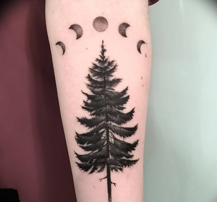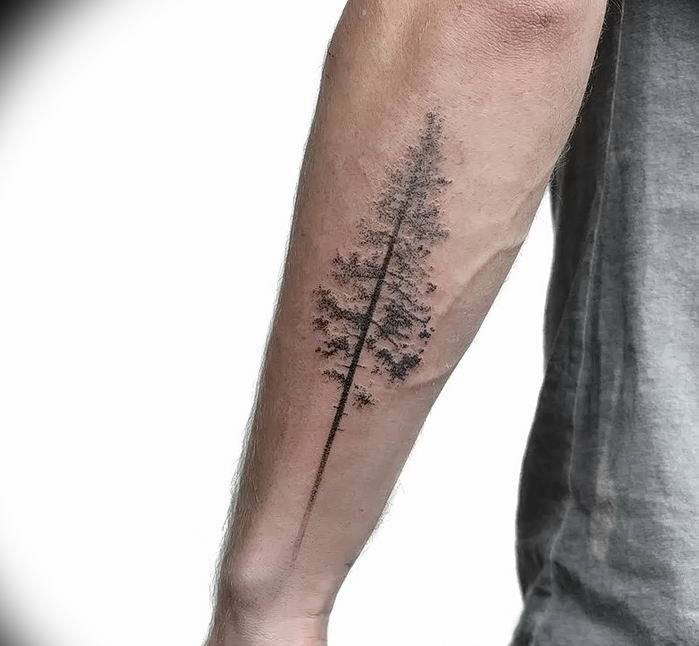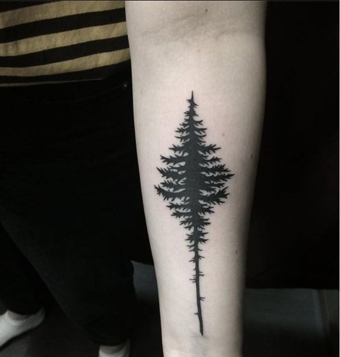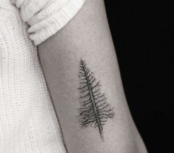 L'épinette de tatouage semble belle et organique avec des ajouts divers. Et à partir de la composition dans laquelle la plante est représentée, la signification du tatouage change. L'arbre lui-même est le symbole du début d'une nouvelle vie, de l'immortalité et de la célébration.Vous pouvez modifier la valeur en utilisant divers ajouts. Principalement utilisé des images d'animaux, d'oiseaux, de corps célestes et d'autres arbres.
